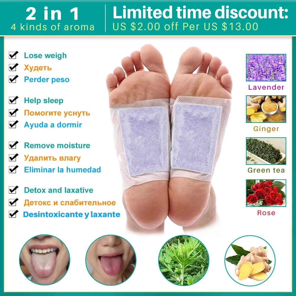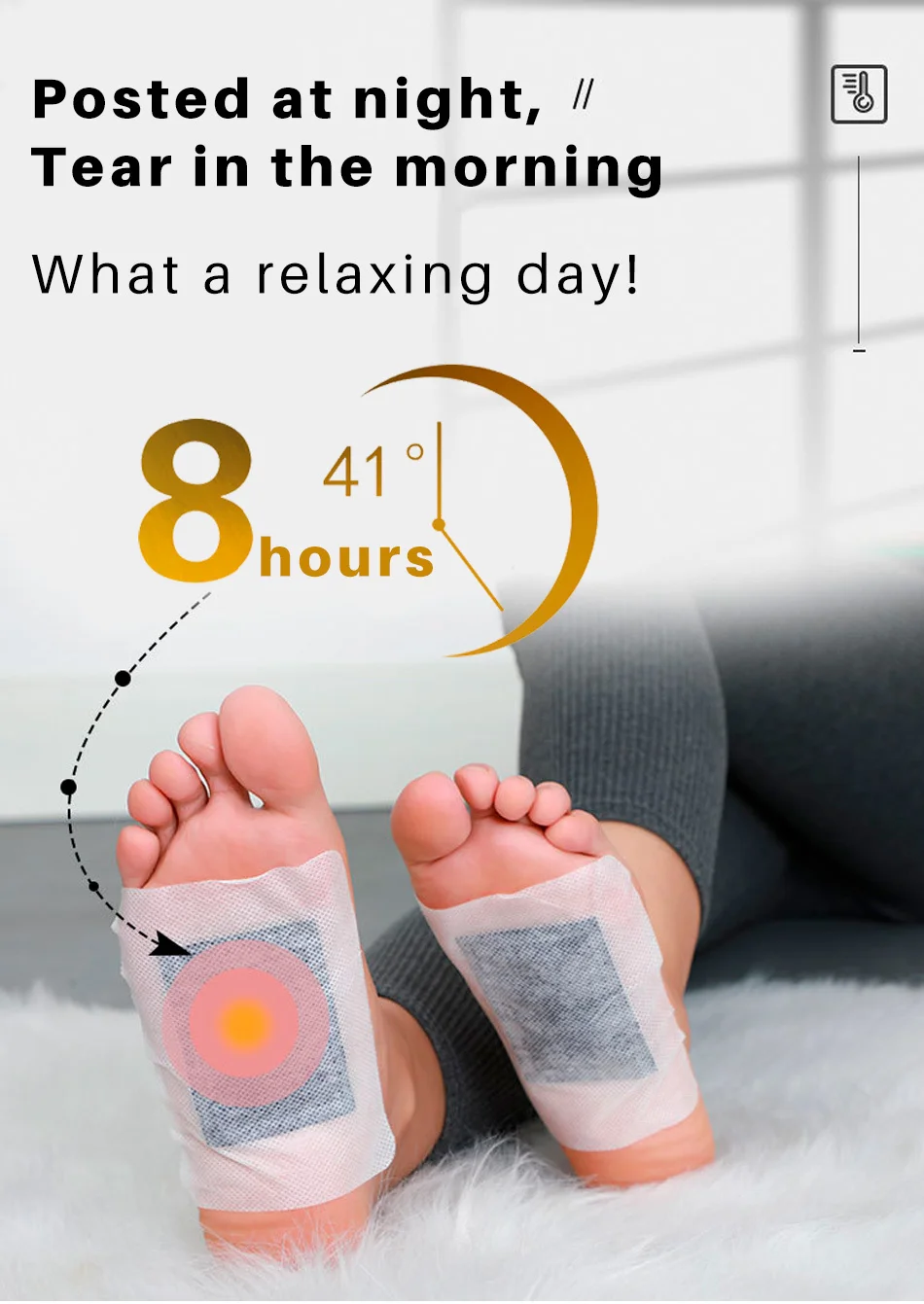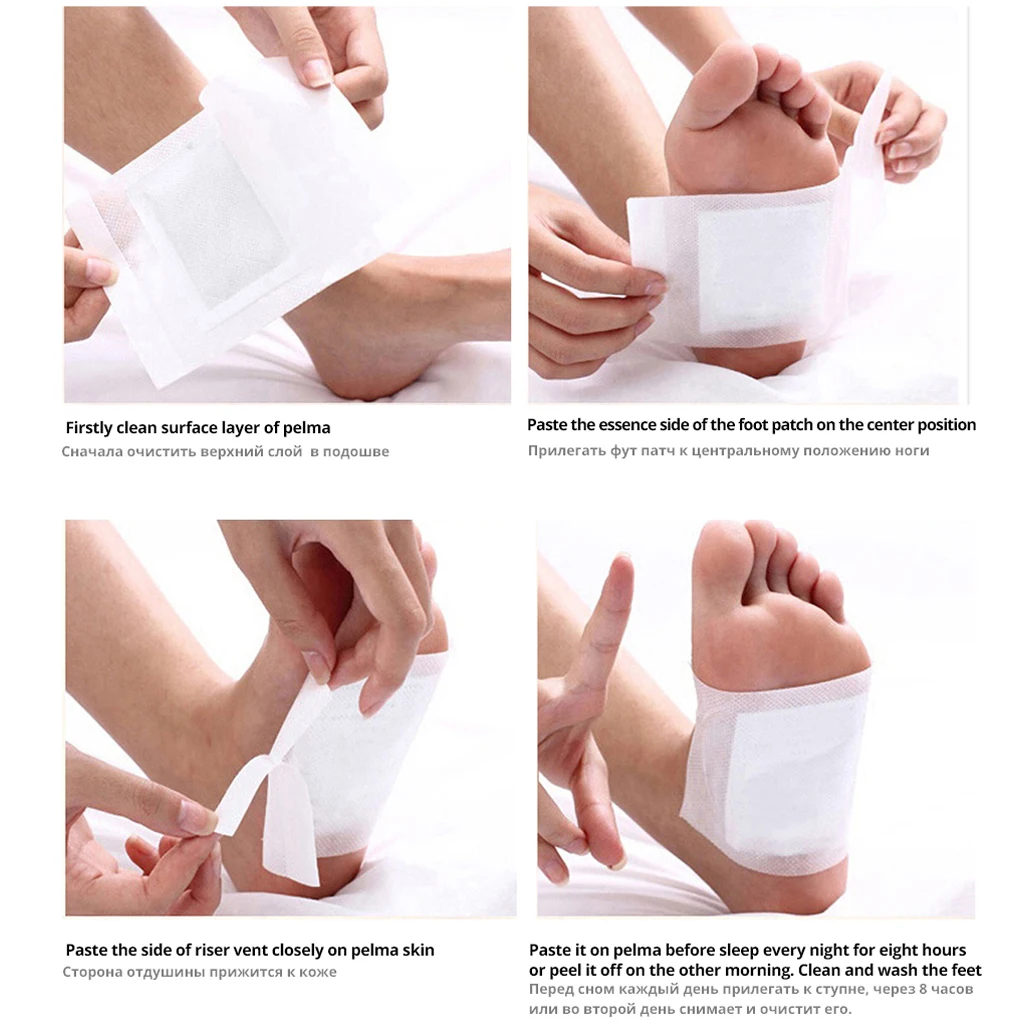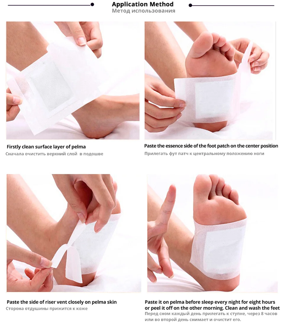 Как работают подушечки для ног?На протяжении сотен лет, восточная медицина понимала, что токсины стекают вниз в организме, накапливаясь в кончиках пальцев ног и лодыжек. Они также понимали, что накопление токсинов приводит к многим дегенеративным болезням. Например, болезненный ревматизм и артрит были вызваны кислотными токсичными жидкостями, собирающимися вокруг суставов.В рефлексотерапии ноги считаются каналами для многих важных органов, с более чем 60 точками акупунктуры на подошвах наших ног.Подушечки для ног содержат натуральные ингредиенты, которые стимулируют эти акупунктурные точки через комбинированное действие дерева/бамбукового уксуса, дальней инфракрасной энергии и отрицательных ионов выбросов. Эта стимуляция приводит к поломке воды и молекул отходов, которые бесплатно блокируют кровообращение и лимфатические системы. Очищение начинается естественным образом на подошвах наших ног.Указания для использования:Нанесите пластырь Kinoki detox за час до кровати.Вымойте и высушите ноги или часть тела перед нанесением пластырей kinoki Detox.Возьмите один клейкий лист и Медленно снимите бумагу.Поместите подкладку для ног на клейкую поверхность, где указано «положить клейкий лист на эту сторону» и поместите на подошву вашей стопы или желаемую область другой части тела.(Носки можно носить при необходимости)Носите в течение 8-10 часов, затем удалите коврик.Протрите поверхность влажным полотенцем, пока оно не станет липким.Использованные пластыри будут выглядеть темно-зеленоватыми или сероватыми, так как они поглощают токсины и отходы от вашего тела.Продолжайте использовать каждую ночь до тех пор, пока не исчезнет обесцвечивание подкладки.При использовании пластырей kinoki появляются признаки осветления, наносите один или два раза в неделю на техническое обслуживание.Теплые советы:Есть 2 шт в небольшой упаковкеВ общей сложности 50 шт/100 шт