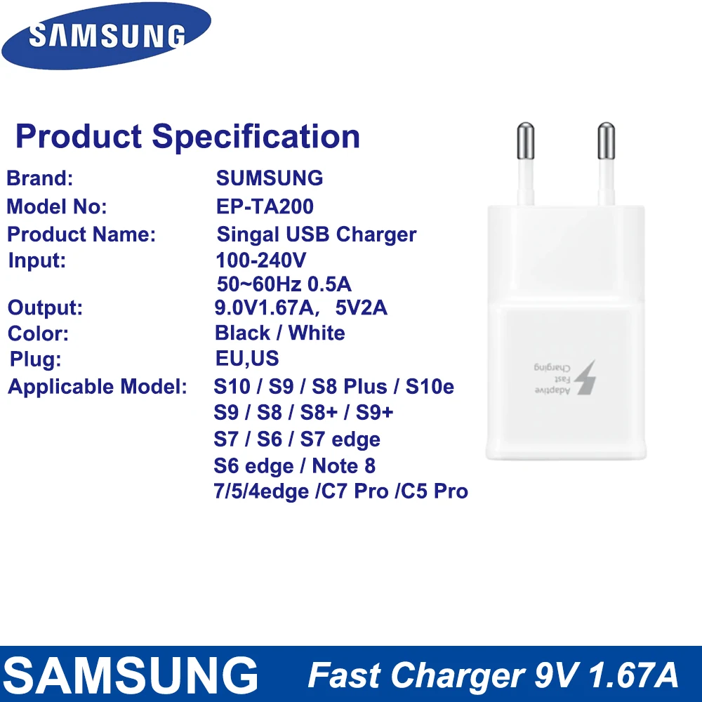 Samsung оригинальное зарядное устройство для быстрой зарядки USB настенный адаптер ЕС США Тип C кабель для передачи данных для Galaxy S10 S9 S8 Plus S10e S11 Note 9 8 A50 S7 S6 Edge Plus J5 J7 9V1.7A или 5V2A 15WОсобенности:1) оригинальный штепсельный usb-адаптер для быстрой зарядки EU/US2) Выход: 5V/2A или 9V1.67A3) оригинальный кабель типа C 100 см4) Подходит для всех телефонов Samsung с портом для зарядки типа C5) мы сделаем все возможное, чтобы отправить товар в тот же день и отправить его на следующий день в выходные дни. Пожалуйста, не стесняйтесь размещать заказ.Пожалуйста, подтвердите, что ваш телефон является портом Type C!