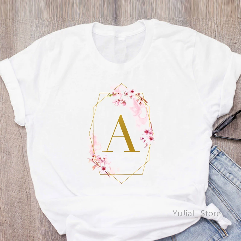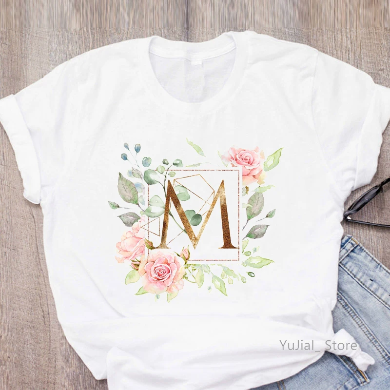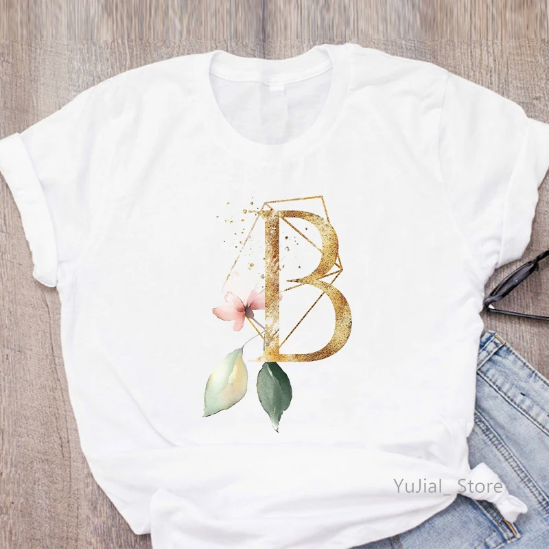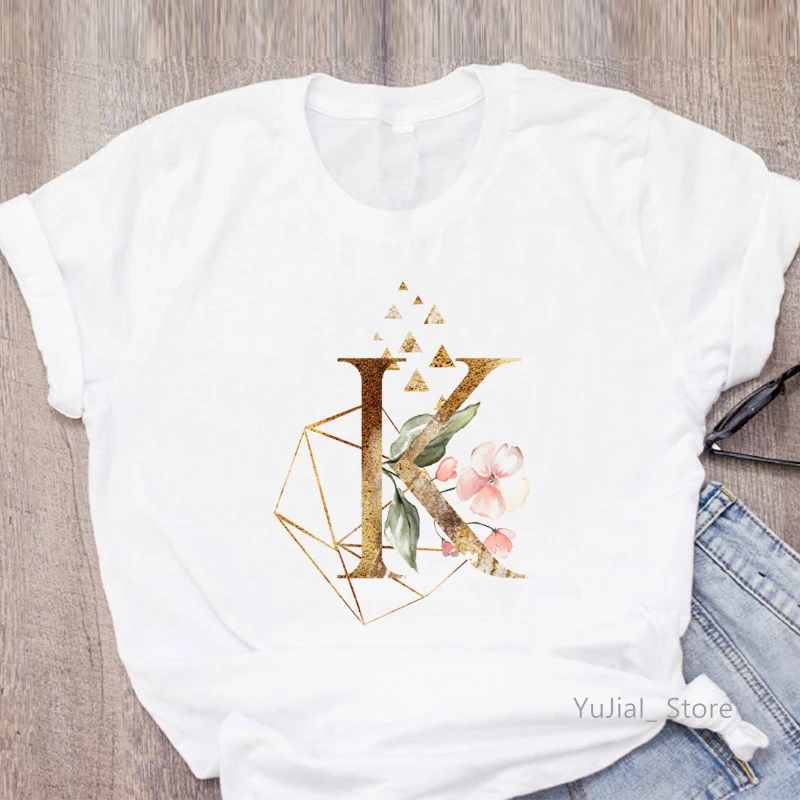 Футболка с принтом в виде золотого алфавита, женская футболка с цветами, женская одежда в Корейском стиле, футболка в стиле Харадзюку, футболка с коротким рукавом
