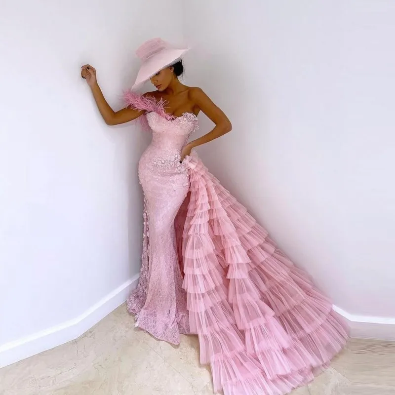 Женское вечернее платье с юбкой годе, розовое кружевное платье со съемным шлейфом и перьями для выпускного вечера
