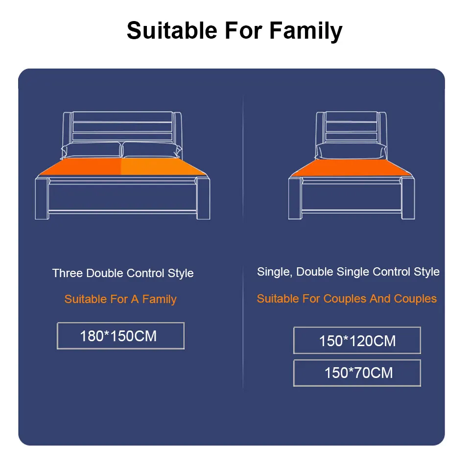 1. Двойной контроллер (150*180 см), есть 3 шестерни, высокая температура, низкая температура и переключатель, может контролировать температуру левой и правой сторон отдельно.2. Одиночный Контролер (70*150/120*150 см), есть 3 шестерни, высокая температура, низкая температура и переключатель, только может контролировать общую температуру.3. Защита от перегрева: во время использования продукта, пожалуйста, предварительно нагревайте продукт в течение 15-30 минут, пожалуйста, настройте на низкую температуру перед глубоким сном. Рекомендация: для безопасности детей, пожалуйста, не используйте его отдельно.