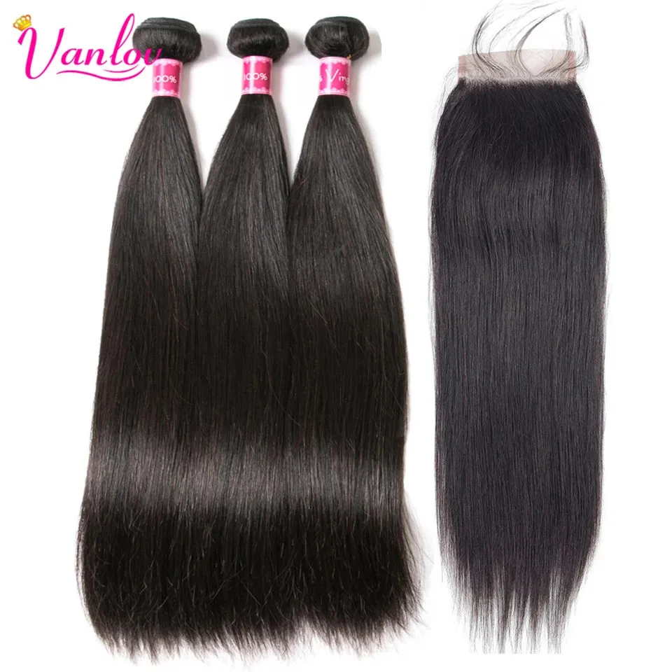 Vanlov прямые человеческие волосы пряди с закрытием предварительно выщипанные малазийские волосы плетение пряди с закрытием 4x 4 Remy волосы для наращивания