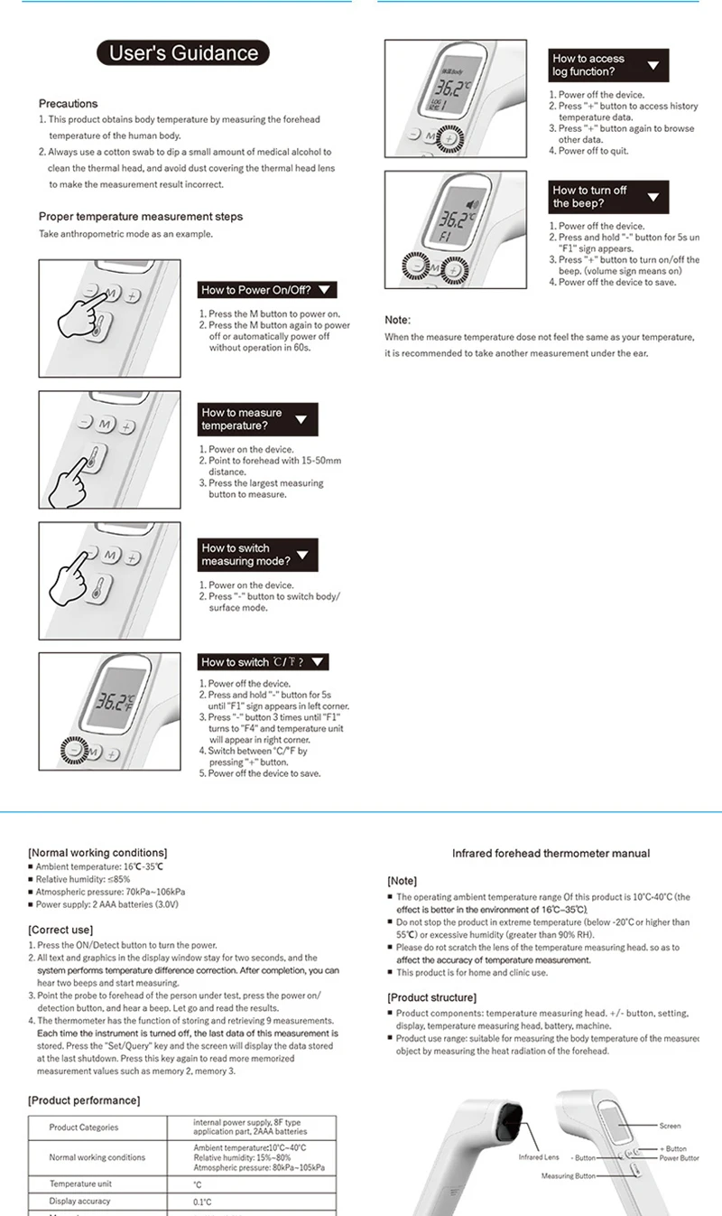 * Широкое применение: термометр для лба широко используется в семье, школе и даже в общественных местах. Подходит для младенцев, младенцев, детей, взрослых и пожилых людей. Подходит для молока, воды для ванны, температуры пищевых продуктов. Подробнее о продукте