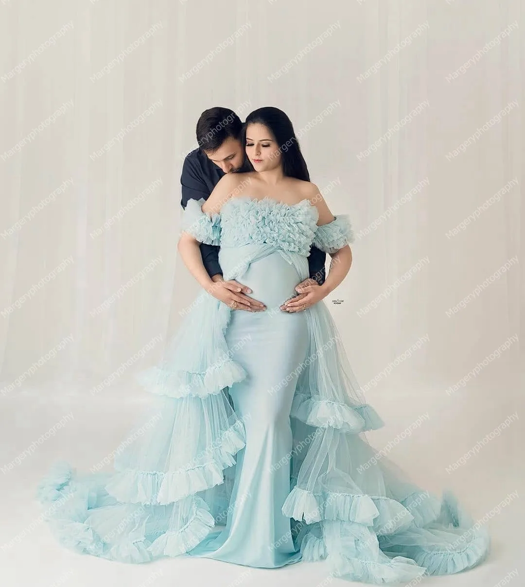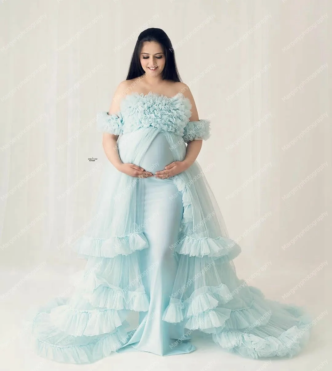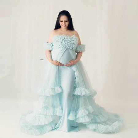 Тюлевое платье для беременных, светло-голубого цвета, с рукавами-крылышками и оборками, со шлейфом, стрейчевое, для невесты