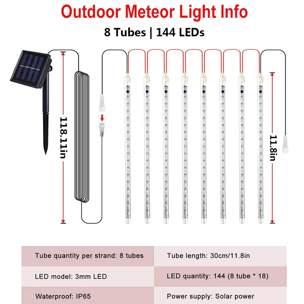 Солнечный Метеоритный Дождь Огни 30 см 8 Трубы 144 светодиоды гирля...
