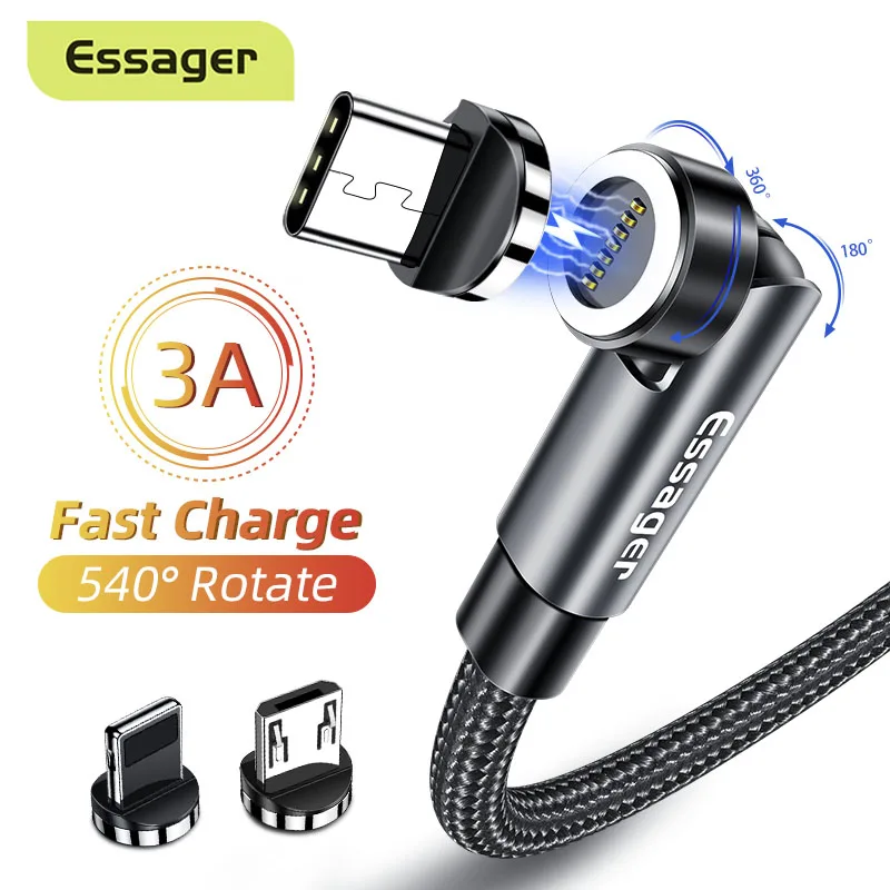 Магнитный кабель Essager, Micro USBType-C, поворотный на 540 градусов, для быстрой зарядки, для iPhone, Xiaomi, Samsung