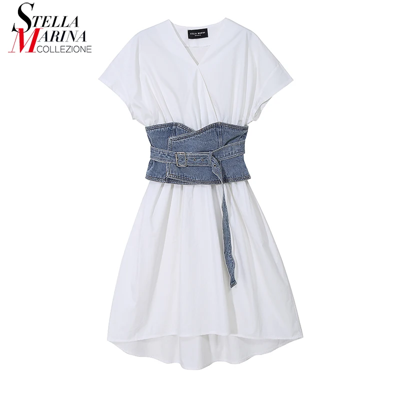 Новинка, летнее женское белое платье, ТРАПЕЦИЕВИДНОЕ джинсовое платье Элегантная Булавка С V-образным вырезом для девочек, стильное платье OL, с поясом с коротким рукавом