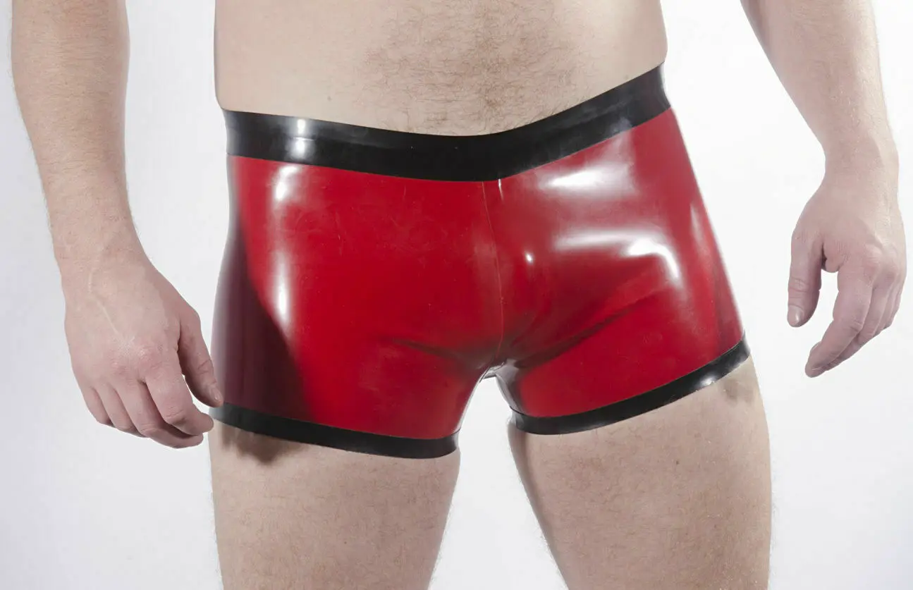 Крутые латексные резиновые черные талии и красные шорты-боксеры с з...