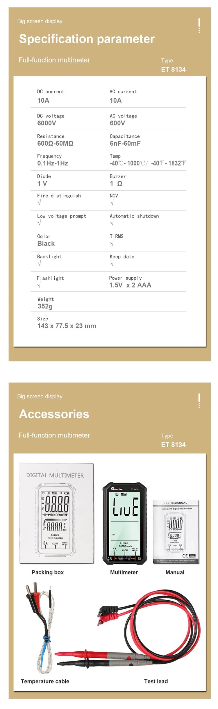 Цифровой мультиметр ET8134, Измеритель постоянного тока, напряжения и емкости, сопротивления, температуры, с ЖК дисплеем 4,7 дюйма