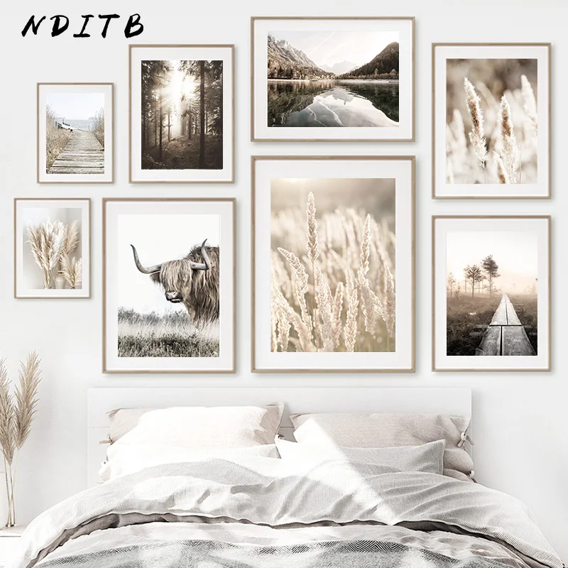 Постер на холсте в скандинавском стиле, Декоративная Настенная картина с принтом природы, травы, коровы, озера, ландшафта, Скандинавская живопись, домашний декор
