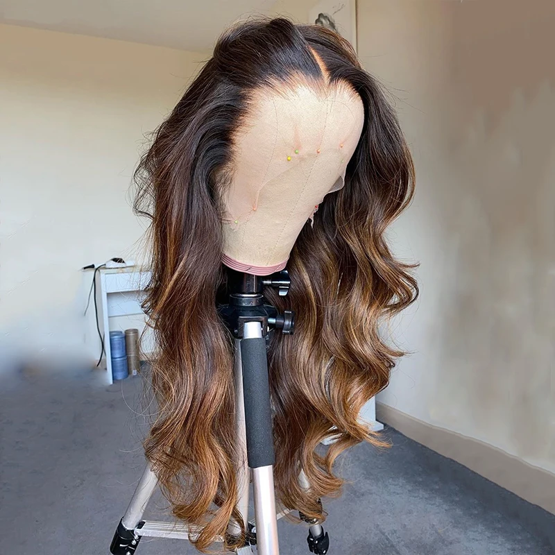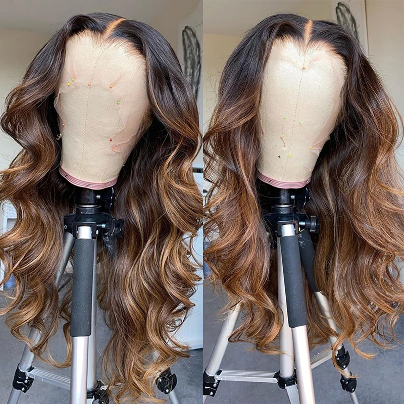 Material: 100% Best Selected Unprocessed Natural Human Hair. Bloom Your Beauty !!! Density: 130% & 180% Cap Size: Medium Size Wig Parting: T Part Lace, Middle Part only, 5 inches parting space. Hairline: Pre Plucked Natural HairLine Knots: Bleached Knots Slightly Hair Color: Highlight Brown Blonde Color Lace Color: Medium Brown & Transparent Lace