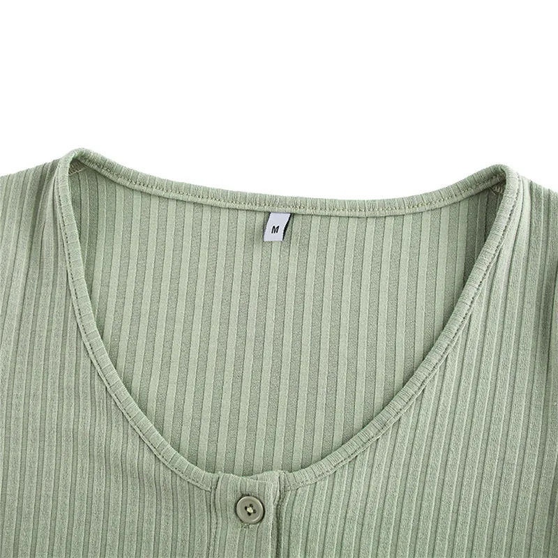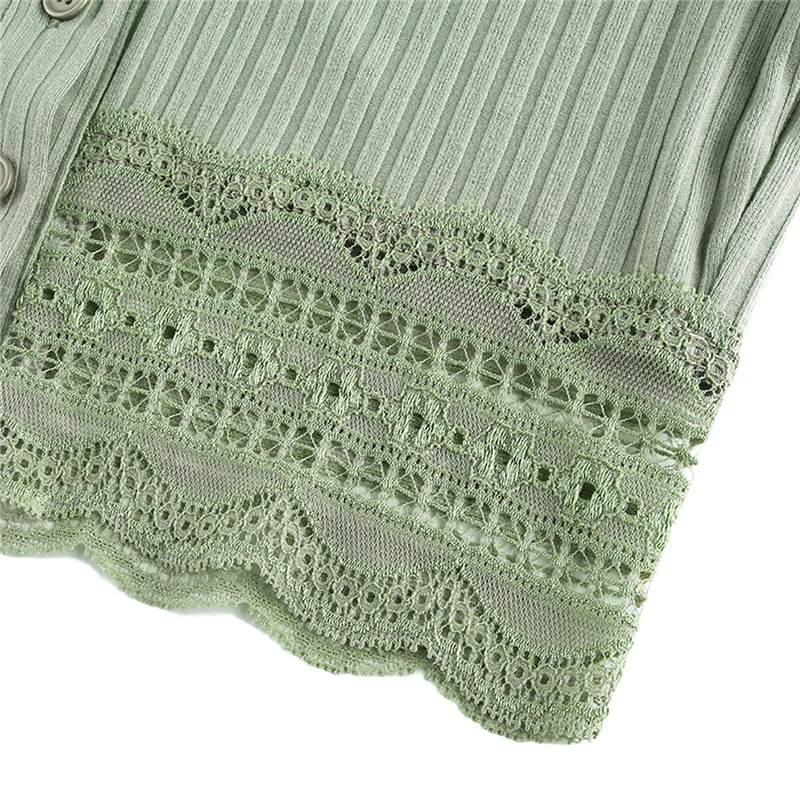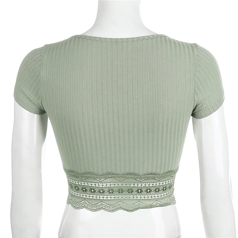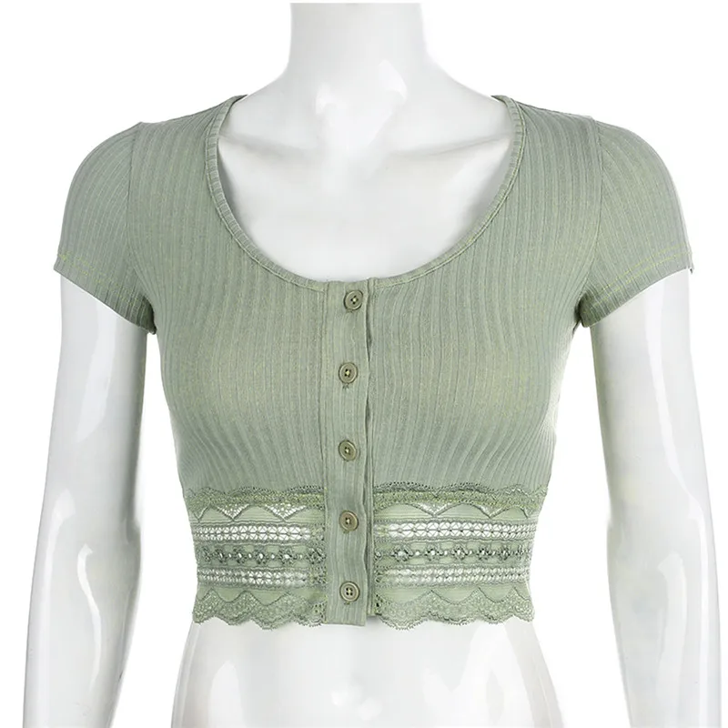 Сексуальный женский топ на пуговицах, вязаный Топ в рубчик в Корейском стиле с коротким рукавом, новый кружевной Повседневный Зеленый Летний Топ для женщин