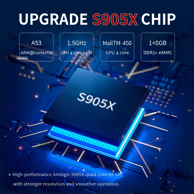 Обновление S905X чип, который мощнее S905M, 1,5 ГГц 4 core 64-разрядные Процессор и MaliTM-450, Бег игры более плавно, разрешая проблему потери кадров.