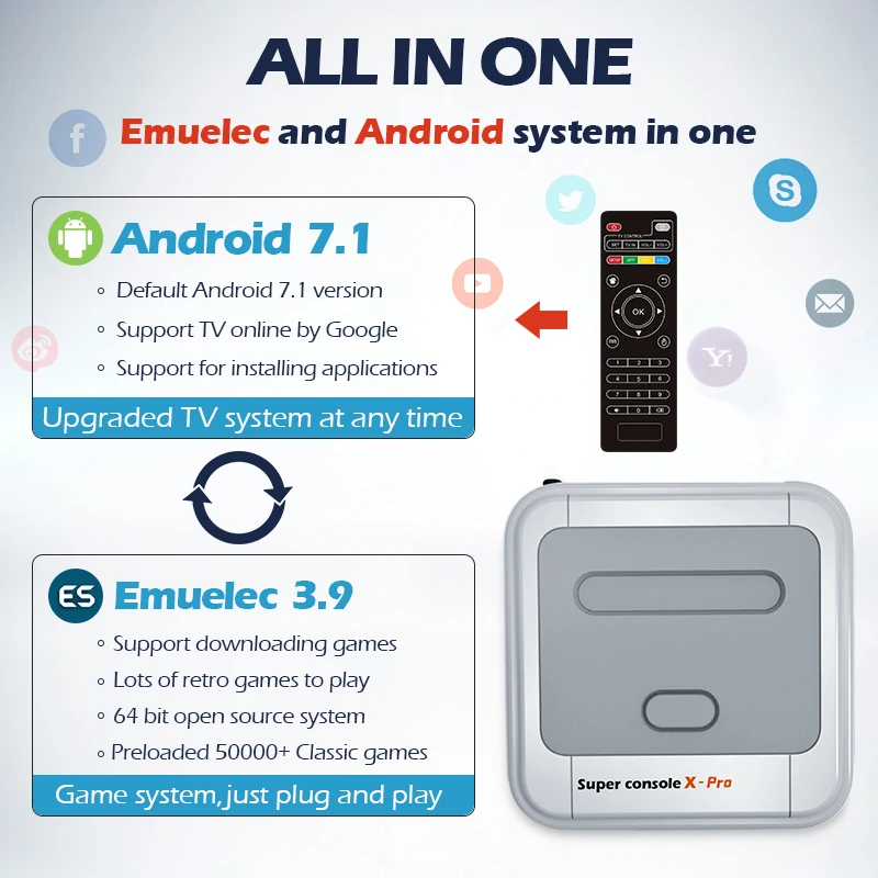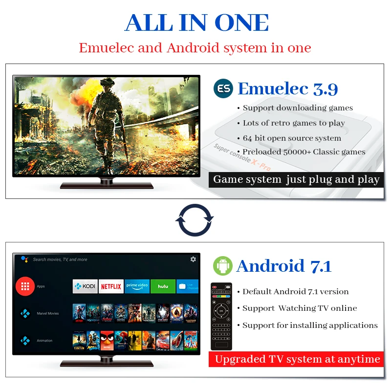 Emuelec и Android системы в одном, Emuelec 3,9 поддерживает 50 +, защита от ультрафиолета, эмуляторы, в том числе 64 бит игры, такие как PS1/Оборудование для PSP/N64/постоянного тока, а также поддерживает self-Загрузка игр. Android 7,1 поддерживает загрузку google play и KODI смотреть бесплатное телевидение.