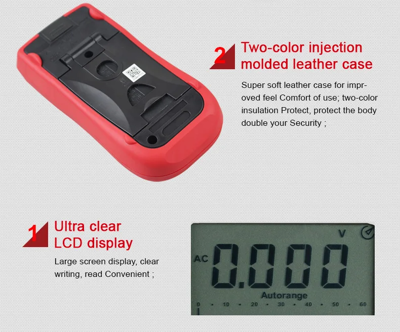 1. Автоматический диапазон2. Макс/мин/режим REL3. RS-232 и usb-интерфейс4. Аналоговый бар5. Индикация низкого заряда батареи6. True RMS7. Пиковое значение/удержание8. Диод/Непрерывный зуммер9. Хранение данных10. Входная защита