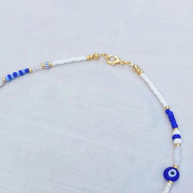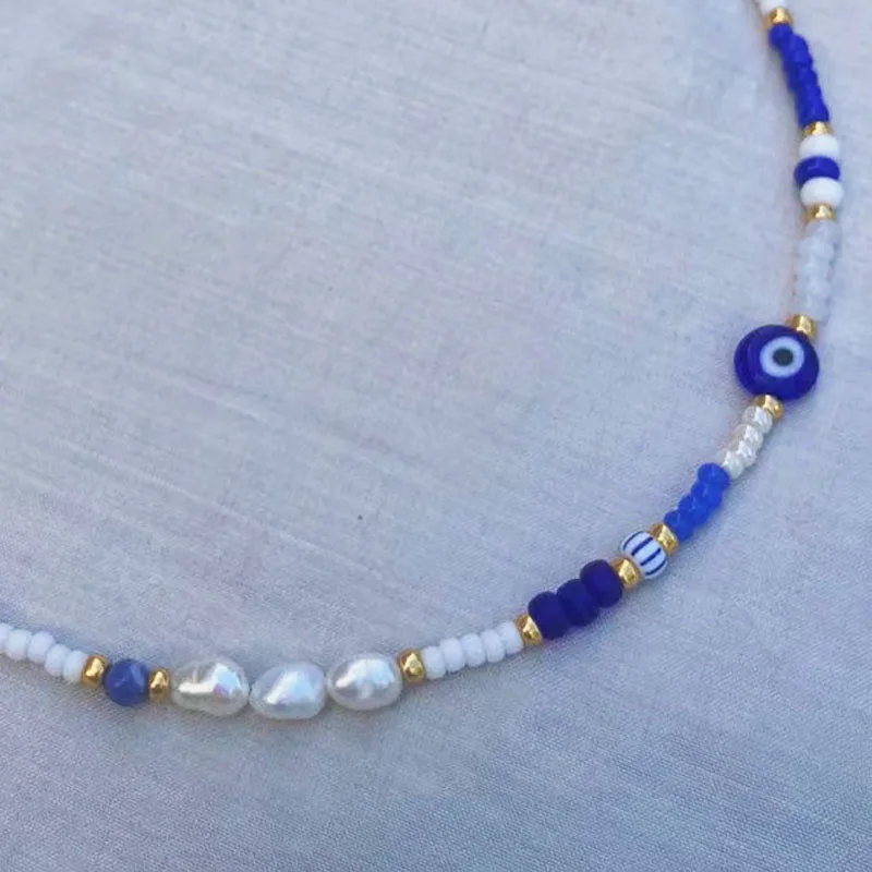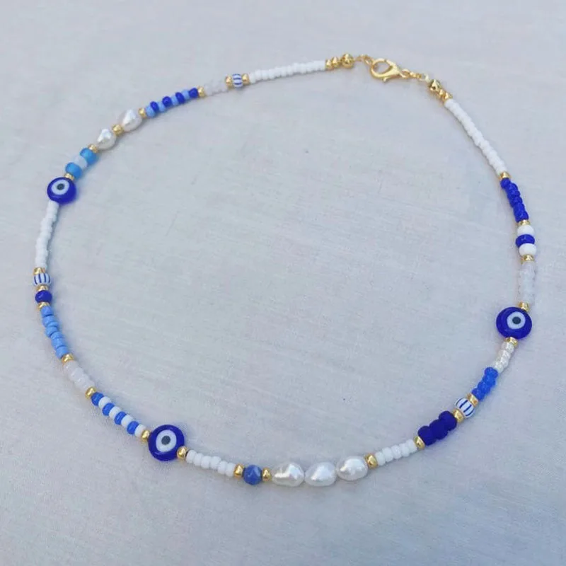 Женские бусы ручной работы с голубыми бусинами, бусы из белого бисера, аксессуары для шеи с натуральным жемчугом, богемные модные бусины для глаз, смешанные и подходящие