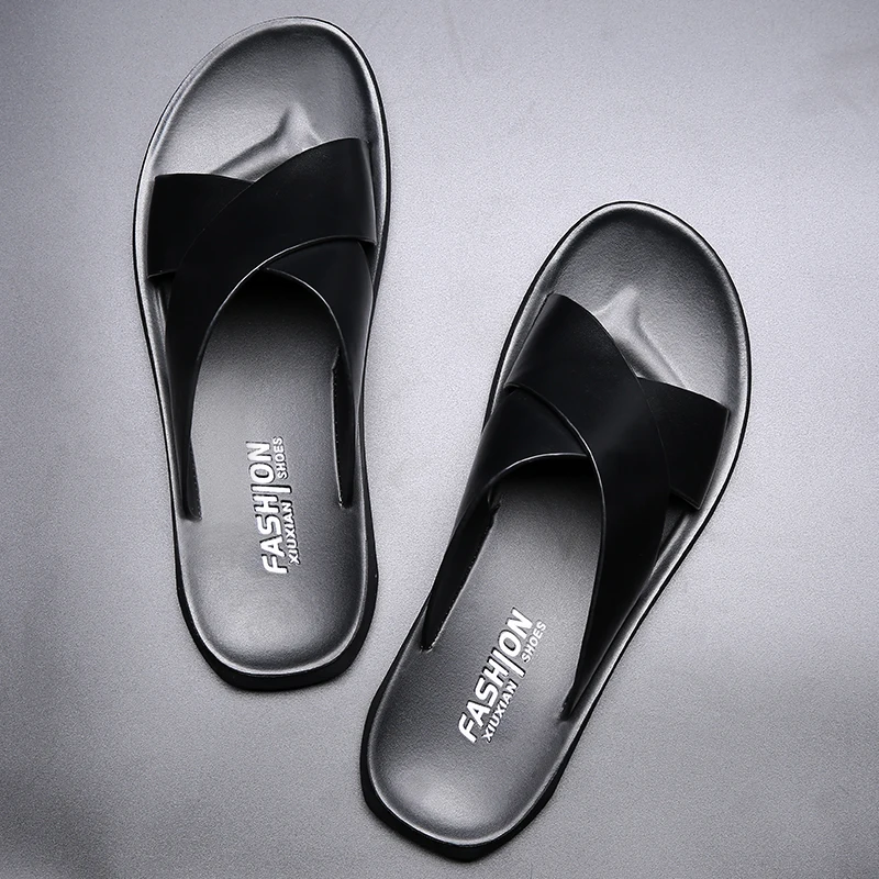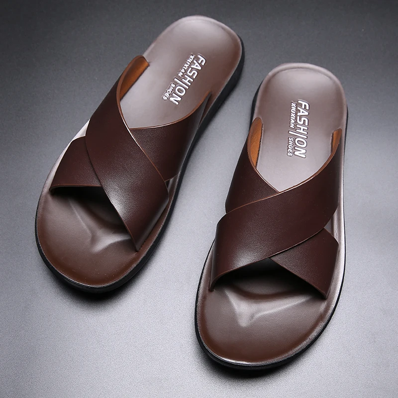 Шлепанцы мужские, кожаные, на плоской подошве, Нескользящие, летние