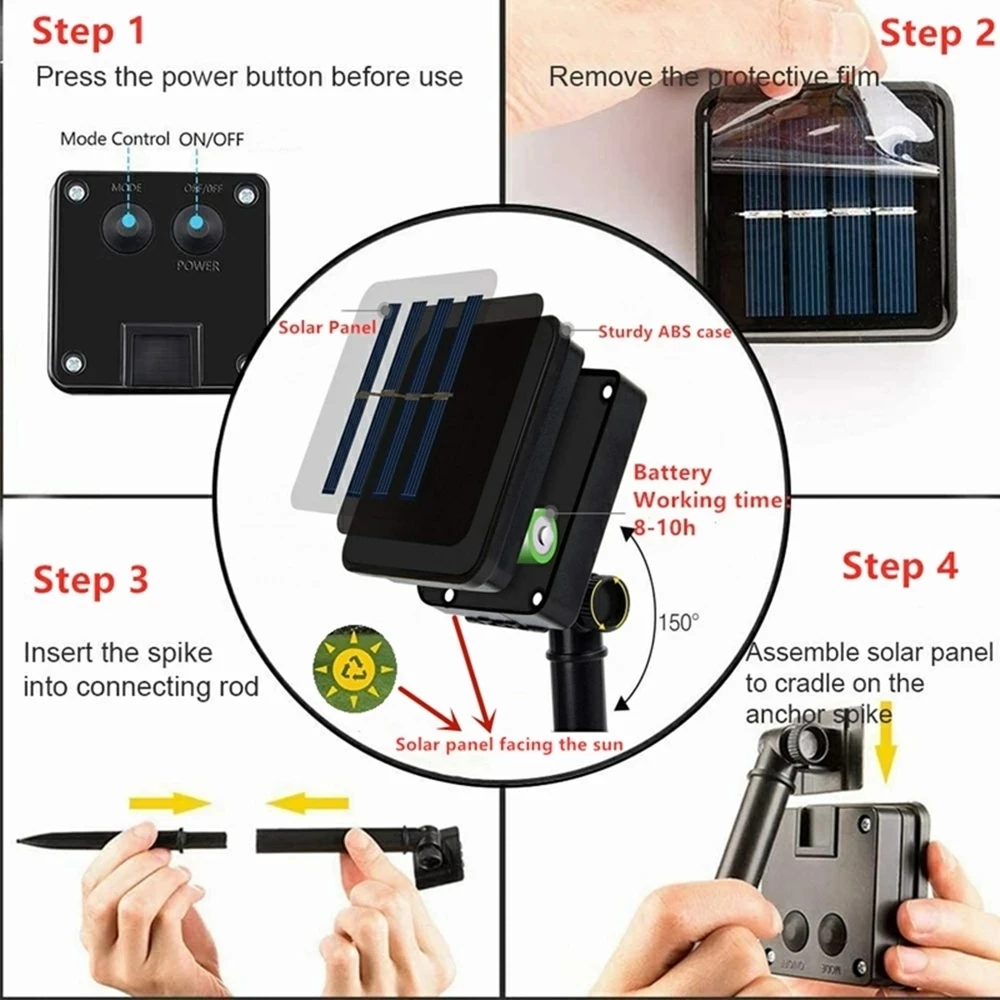 Шаг 1: Нажмите кнопку питания перед использованием.Шаг 2: Снимите защитную пленку.Шаг 3: вставьте шип в шатун.Шаг 4: Соберите солнечную панель для колыбели на якорном шипе.Шаг 5: Поместите солнечную панель в ваш сад и убедитесь, что панель полностью подвержена воздействию солнца.
