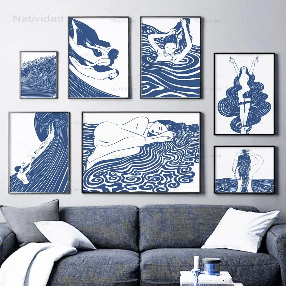 Абстрактные винтажные картины на холсте с изображением голубого моря обнаженной девушки, постеры и принты для декора гостиной
