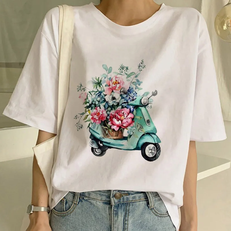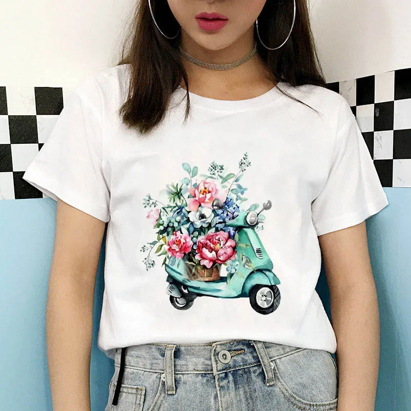 Женские туфли с цветочным принтом автомобиля Леди Мода Короткие дамские сексуальные рукав Эстетическая одежда летняя футболка графической женская футболка, Т-футболка