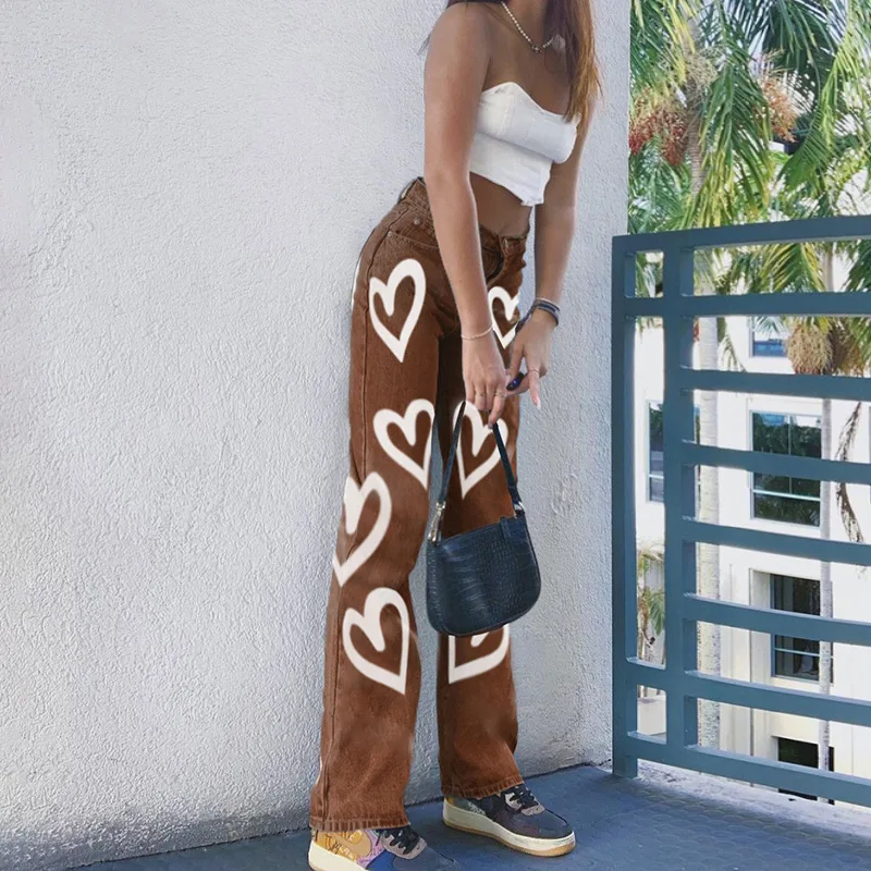 2021 повседневные Прямые узкие джинсы с принтом сердечек, винтажные брюки с высокой талией, женские модные джинсовые брюки, женская уличная одежда