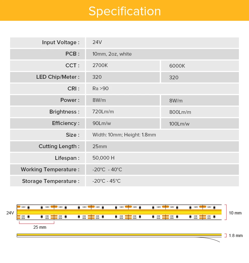 Спецификация: Входное напряжение: от AC110-240V до 24 в пост. Тока. FPCB ширина: 10 мм. Количество СВЕТОДИОДНЫЙ: 640 светодиодный s/M. Длина резки: каждые 25 мм. Цветовая температура: теплый белый (3000K)-натуральный белый (4000K)-холодный белый (6000K). Индекс цветопередачи: Ra>90. Рабочая температура: -20 ℃-+ 45 ℃. Температура хранения: -20 ℃-+ 60 ℃. Угол обзора: 180 °. Посылка: 1 шт. 3 м/5 м FCOB CCT светодиодные полосы света. 1 шт. RF 17 клавиш CCT контроллер. 1 шт. AC110-240V в DC24V источник питания.