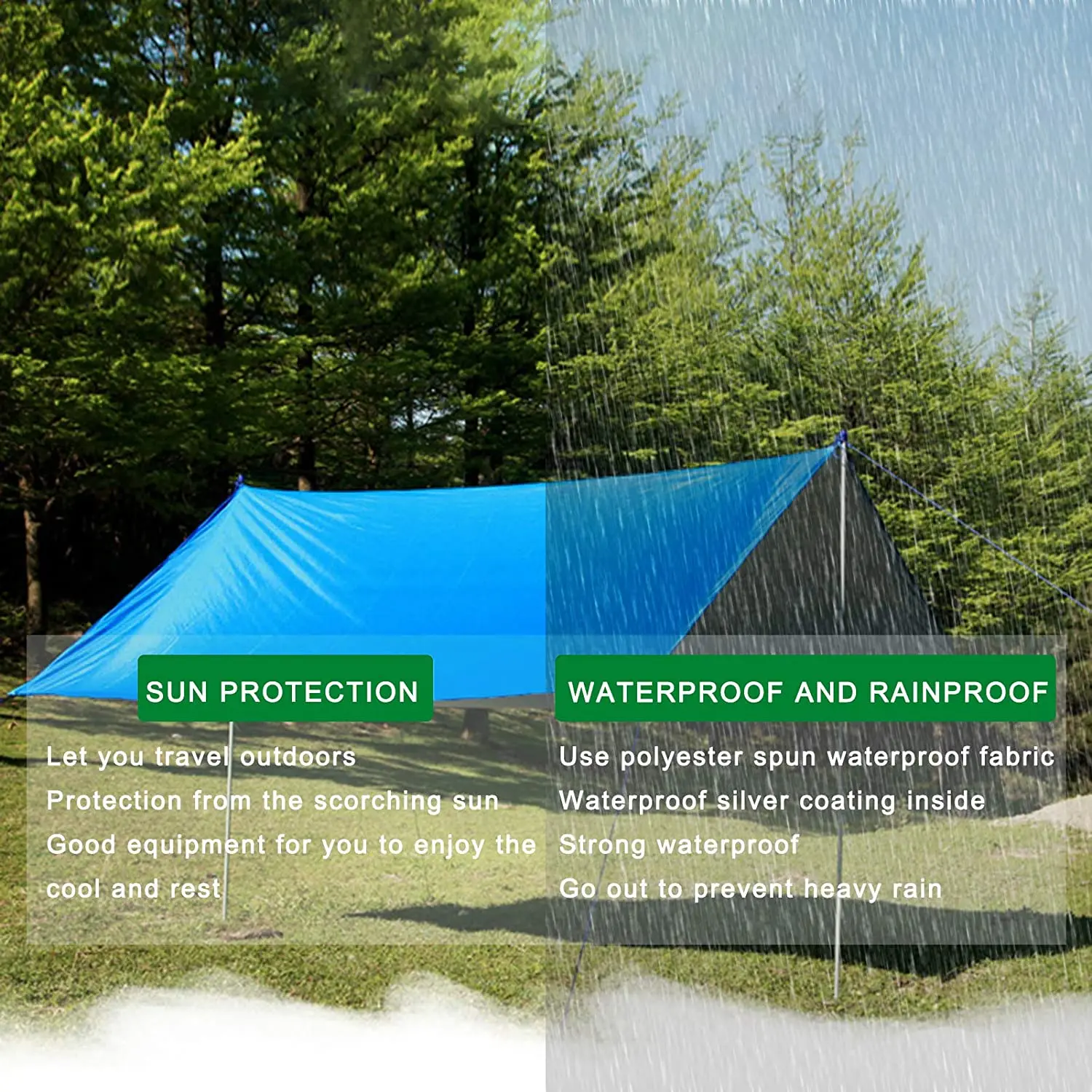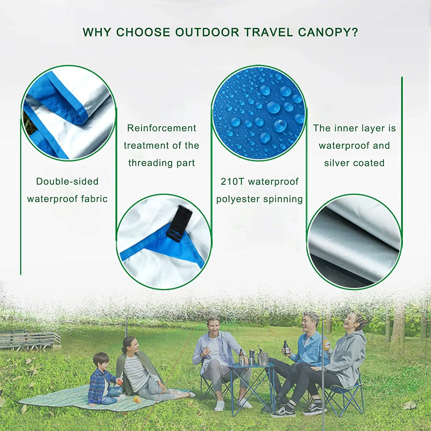 1. Двусторонняя водонепроницаемая ткань, внешний слой-полиэфирная пряжа 210T, внутренний слой-водонепроницаемое серебряное покрытие, водонепроницаемый эффект лучше.