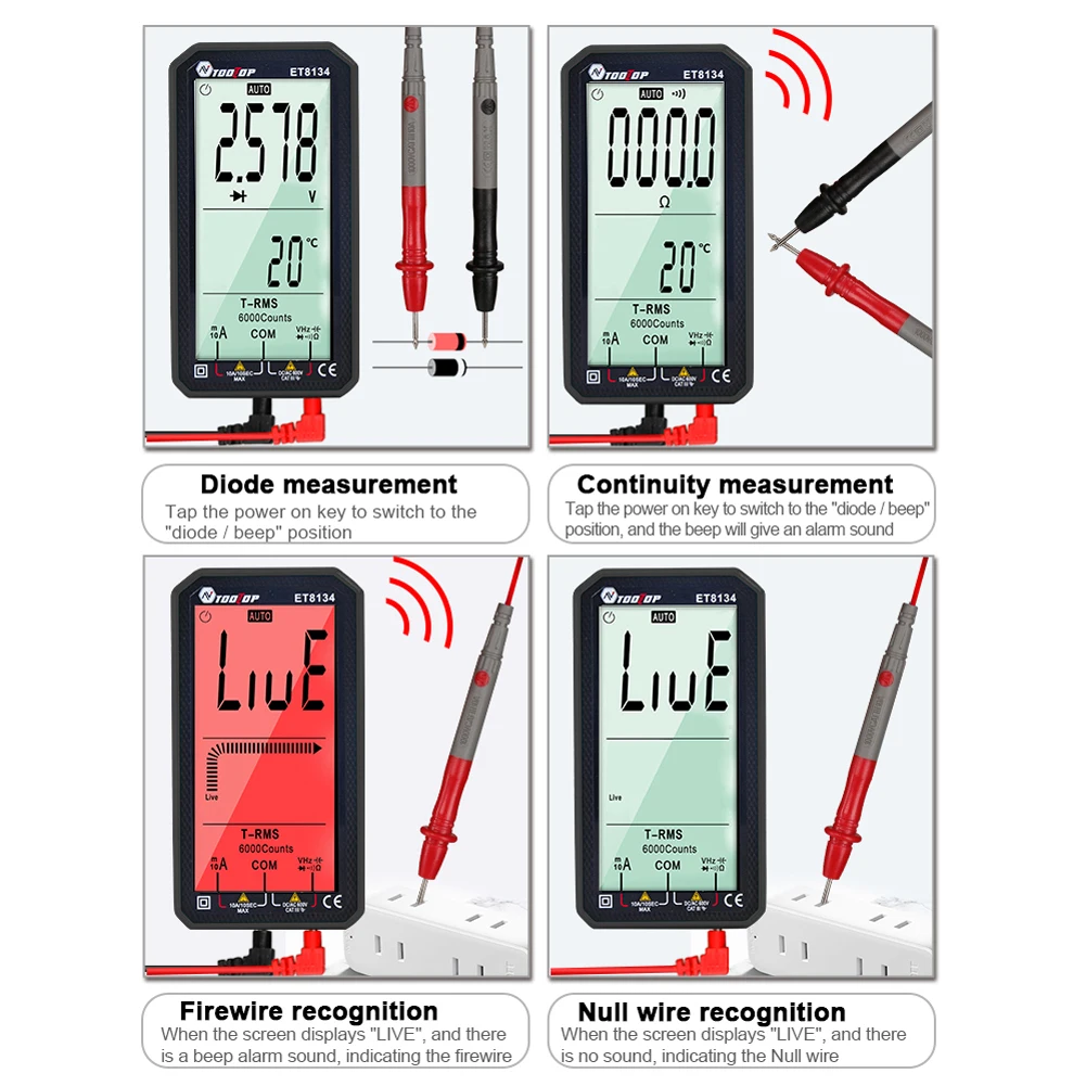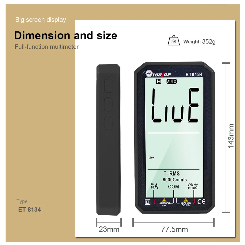 Этот мультиметр с большим ЖК-экраном, и он маленький по размеру, как фаблет, более практичный и новый. С многофункциональными, такими как напряжение переменного тока, напряжение постоянного тока и Измерение тока, сопротивление, емкость, измерение диодов и так далее. Приходите и попробуйте, это не подведет вас.Особенности:С 4,7 дюймов экран высокой четкости, который позволяет вам управлять и смотрите данные более четко, даст вам лучший опыт использования.Многофункциональный: он используется для измерения напряжения переменного и прямого тока и тока, измерения емкости и сопротивления, бесконтактного напряжения и измерения температуры NCV, измерения диодов и непрерывности, распознавания проводов firewire и null.С функцией двойного звукового сигнала и светильник, который поможет вам лучше напомнить.С мягкой и прочной защитной крышкой и функцией сейсмического pro-tection, которая может защитить мультиметр и продлить время обслуживания.С функцией фонарика и подсветки вы можете использовать его в условиях тусклой освещенности или в темноте.Характеристики:Материал: АБС-пластикЦвет: черныйМощность: 2 аккумулятора * AAA (не входит в комплект)Постоянный ток: 10AТок переменного тока: 10AНапряжение прямого тока: 6000 ВНапряжение переменного тока: 600 ВСопротивление: 600Ω ~ 60MΩЕмкость: 6nF ~ 60mFЧастота: 0,1 Гц ~ 1 ГцТемпература: -40 ℃ ~ 1000 ℃/-40 ℉ ~ 1832 ℉Диод: 1 вЗуммер: 1ΩРазличие между огнем: ДаNCV: ДаПодсказка низкого напряжения: ДаАвтоматическое выключение: ДаT-RMS: ДаПодсветка: ДаСохранить дату: ДаФонарик: ДаРазмер изделия: 143*77,5*23 мм/5,6*3,1 * 0.9inРазмер посылка: 153*87,5*30 мм/6,0*3,4 * 1.2inПосылка Вес: 339 г/12,0 унцииУпаковочный лист:1 * мультиметр1 * Руководство пользователя1 * Температурный кабель1 * TestHead