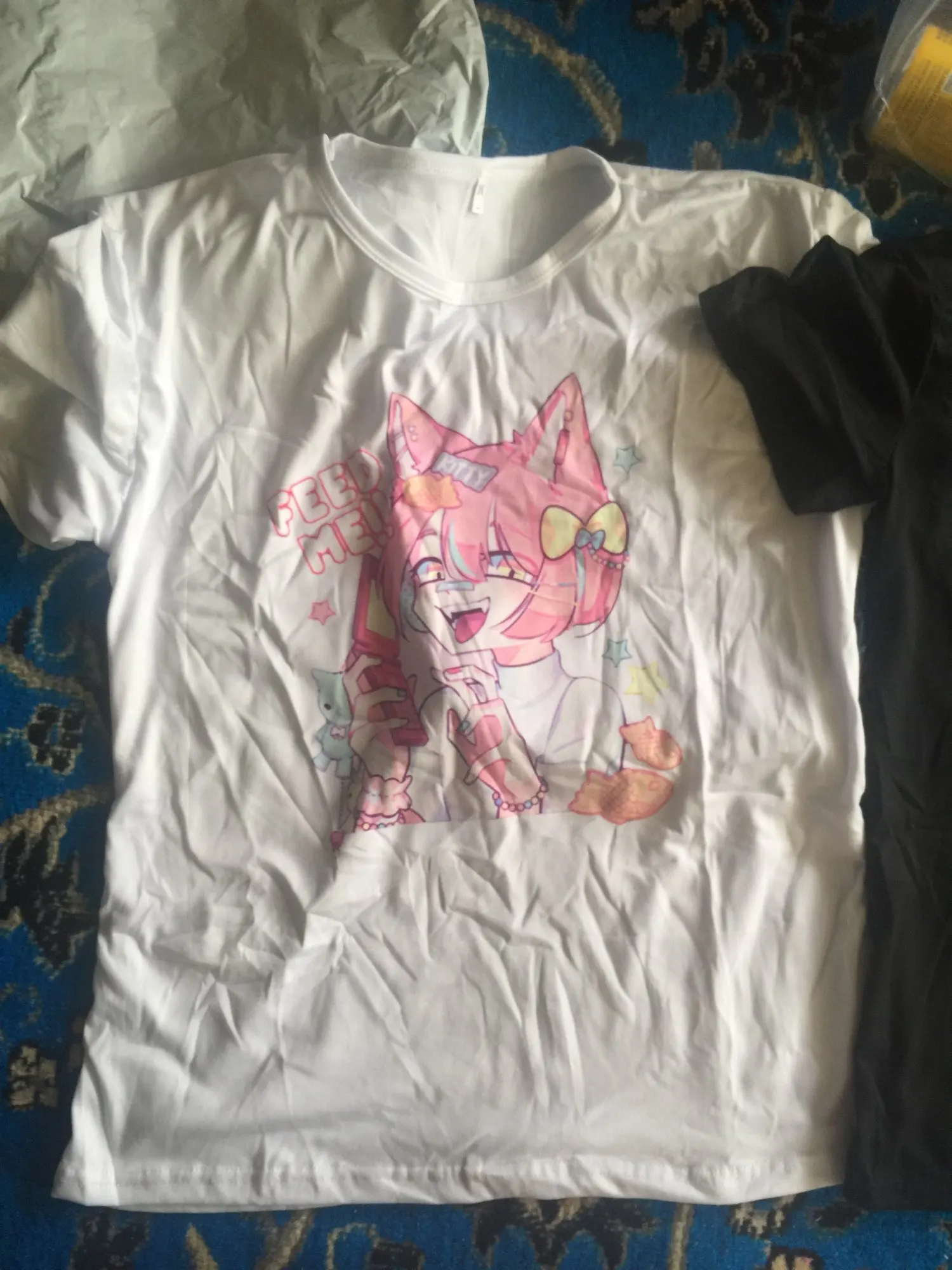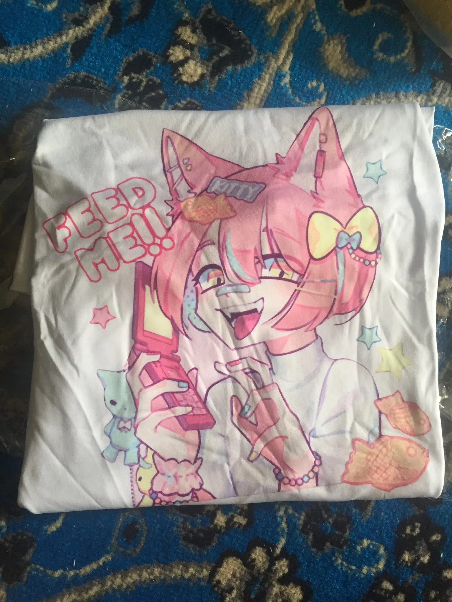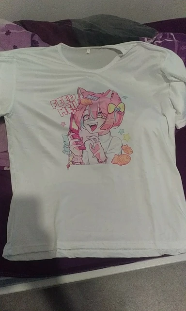 На самом деле, это говорит: «кормите меня!» да! Мне нравится, насколько большой принт соответствует соотношению рубашки и как он в основном напечатан на ткани, так что мне не придется беспокоиться о том, что на рубашке будут видны трещины (Если это имеет для кого-то значение). Товар был доставлен довольно морщинистым, поэтому некоторые из этих прямолинейных ниток заставили меня поставить под вопрос специфическое качество рубашки, но сама ткань очень мягкая (например, полиэфирная ткань, я думаю). Я рекомендую тем, кто покупает эти рубашки в белом цвете, что их придется стирать вручную, так как этот тип ткани имеет свойство легко испачкать от темных тканей.