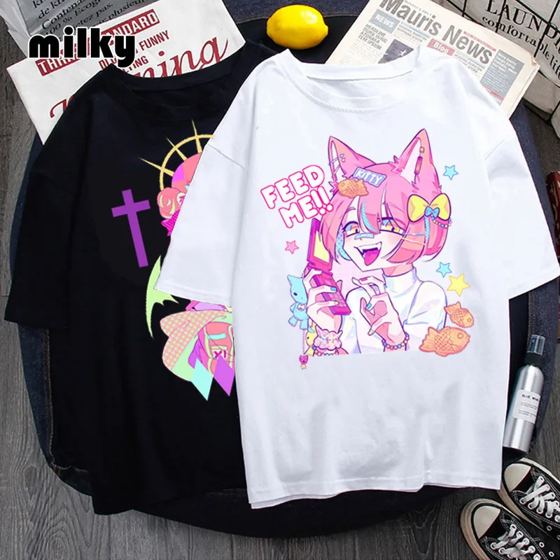 Женские черные топы с аниме принтом Harajuku, женские футболки, Готическая уличная одежда, футболка с коротким рукавом и графическим принтом, Женская кавайная Эстетическая футболка y2k kpop