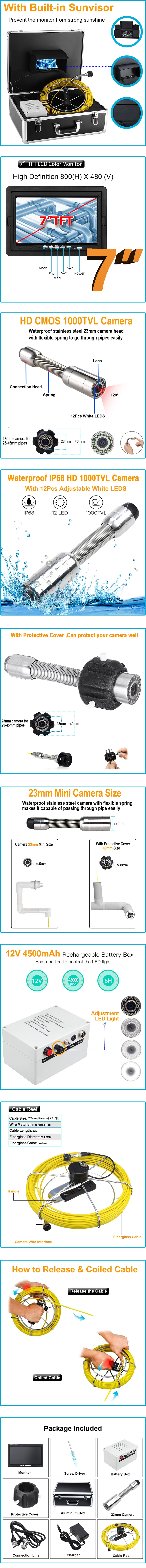 Камера для осмотра канализационных труб, 7 дюймов, цветной экран, камера 23 мм, 12 светодиодов, 20 кабелей с функцией DVR