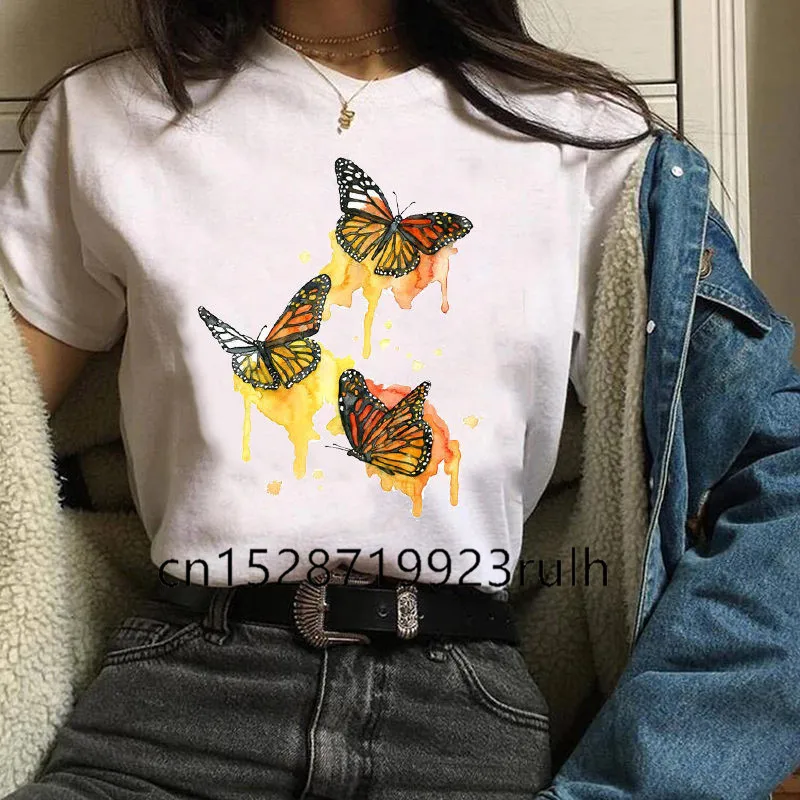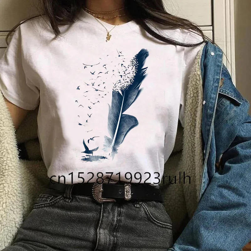Женская футболка с акварельным принтом и перьями, в стиле Харадзюку, Повседневная футболка в стиле 90-х