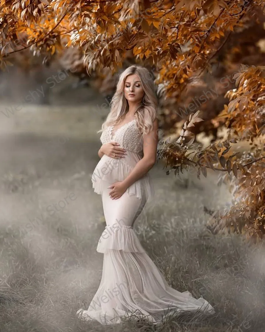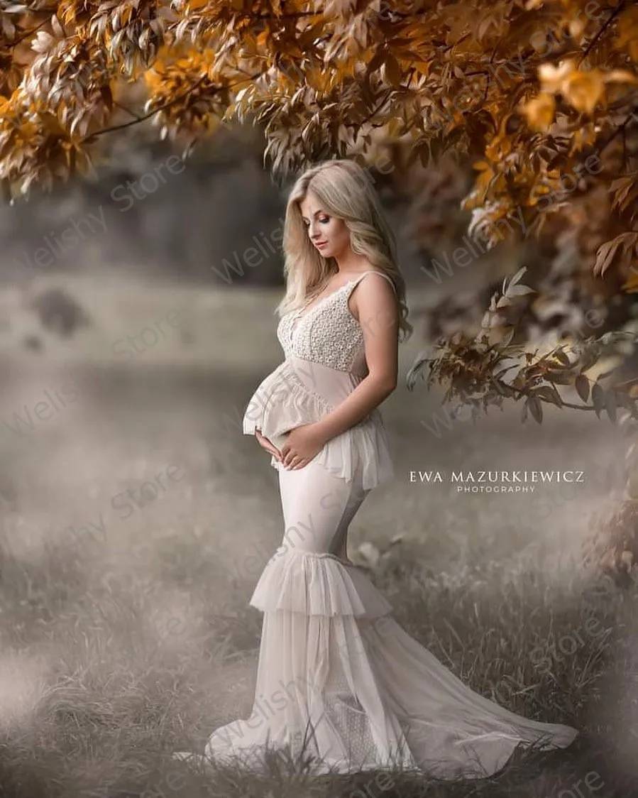 2021 бежевое кружевное платье с аппликацией и V-образным вырезом, длинные платья для беременных с юбкой-годе, женское Тюлевое платье на бретелях-спагетти длиной в Пол с многоярусными оборками