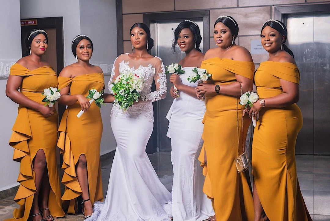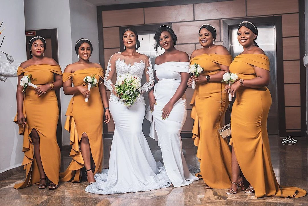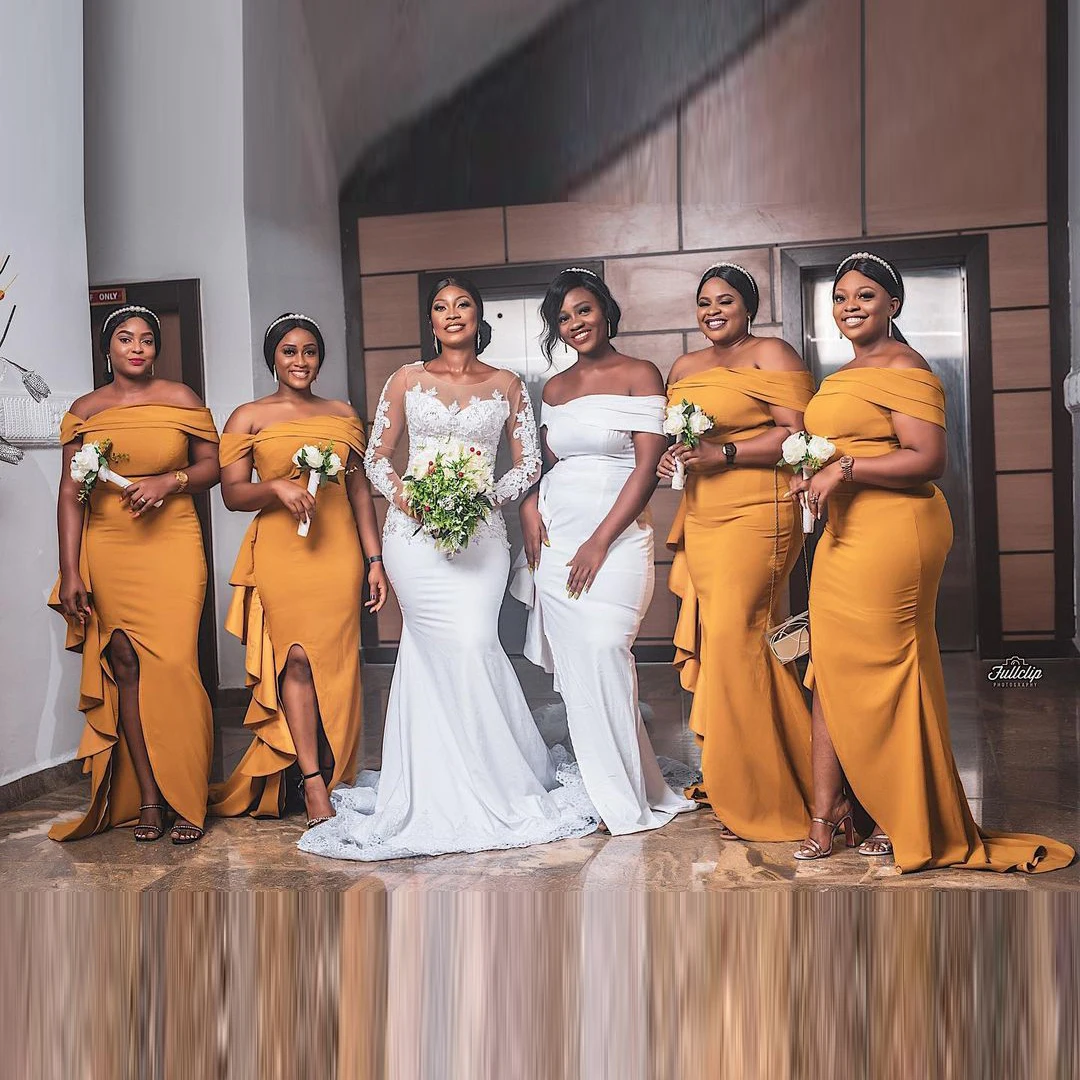 Золото под традиционное платье Aso Ebi платья подружек невесты русалка Slash шеи Кепки рукава боковые Разделение с оборки Атлас Длинные Свадебная вечеринка платья на заказ