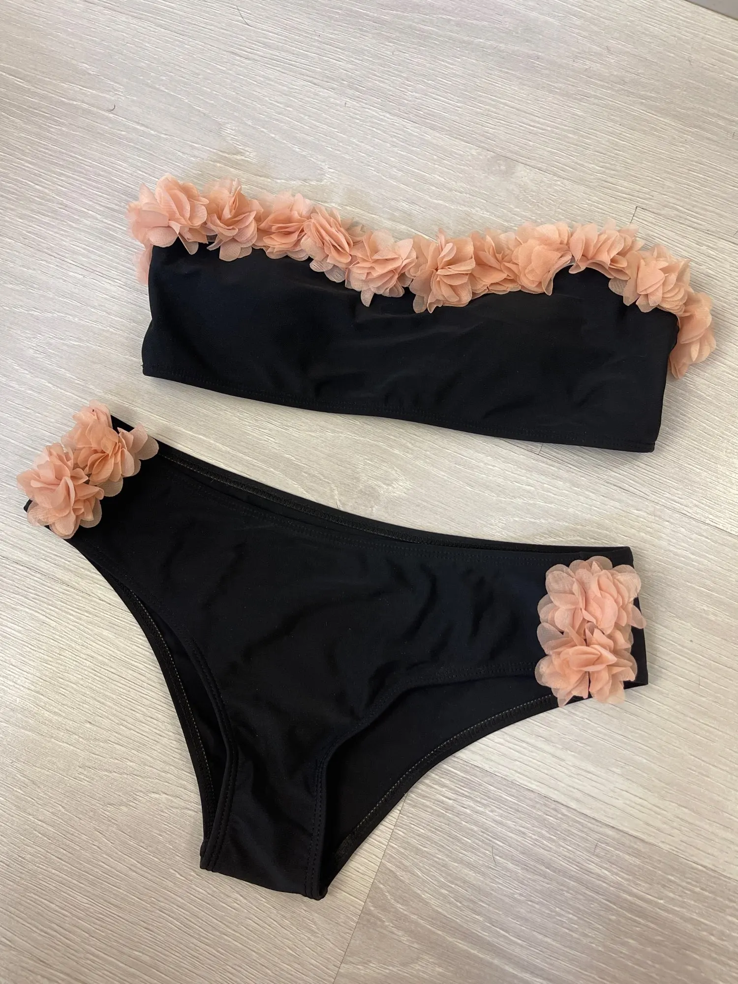 Милый женский купальник-бикини с цветочным рисунком, черное бикини без бретелек, женский купальный костюм из двух частей