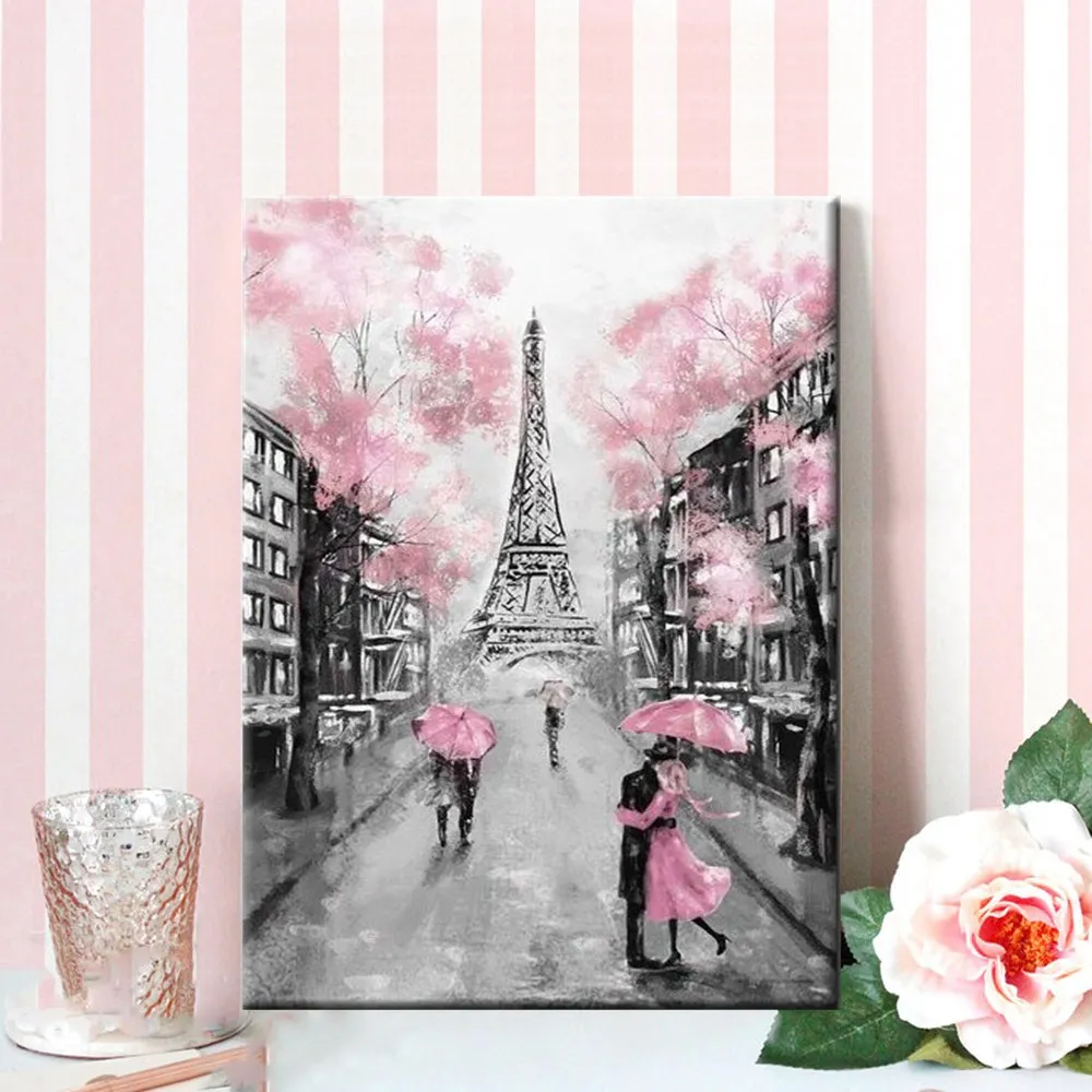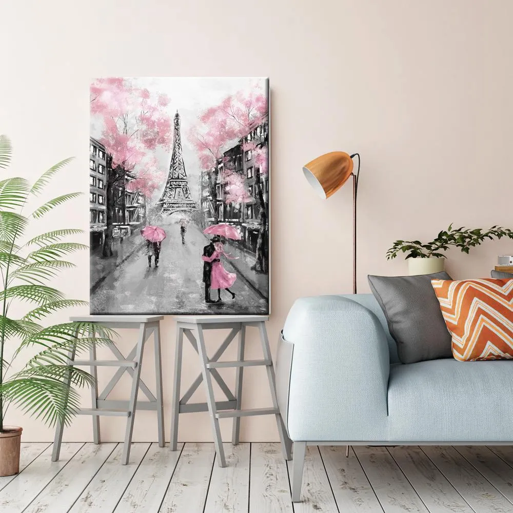 Парижская Эйфелева башня дождливая улица пейзаж Картина на холсте романтическая пара Розовый Зонт-плакат Декор для гостиной спальни эстетика