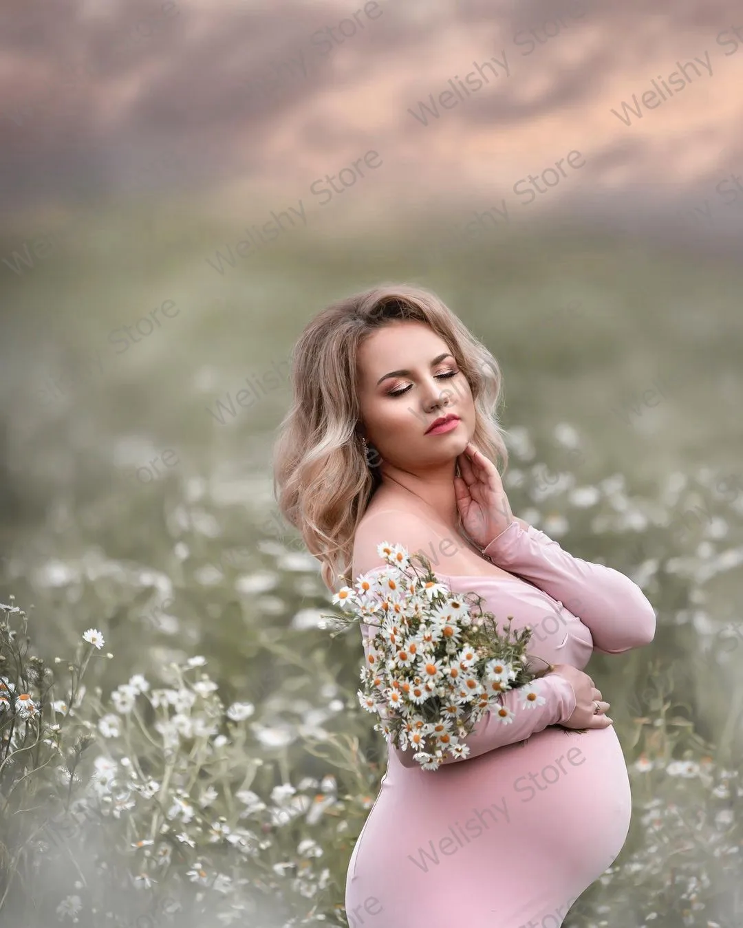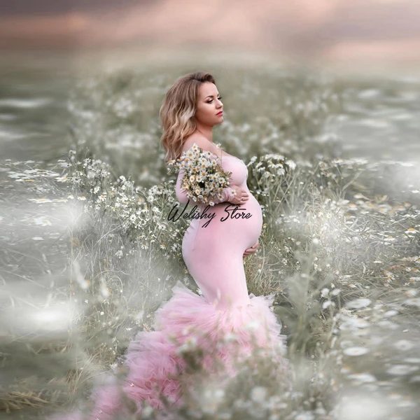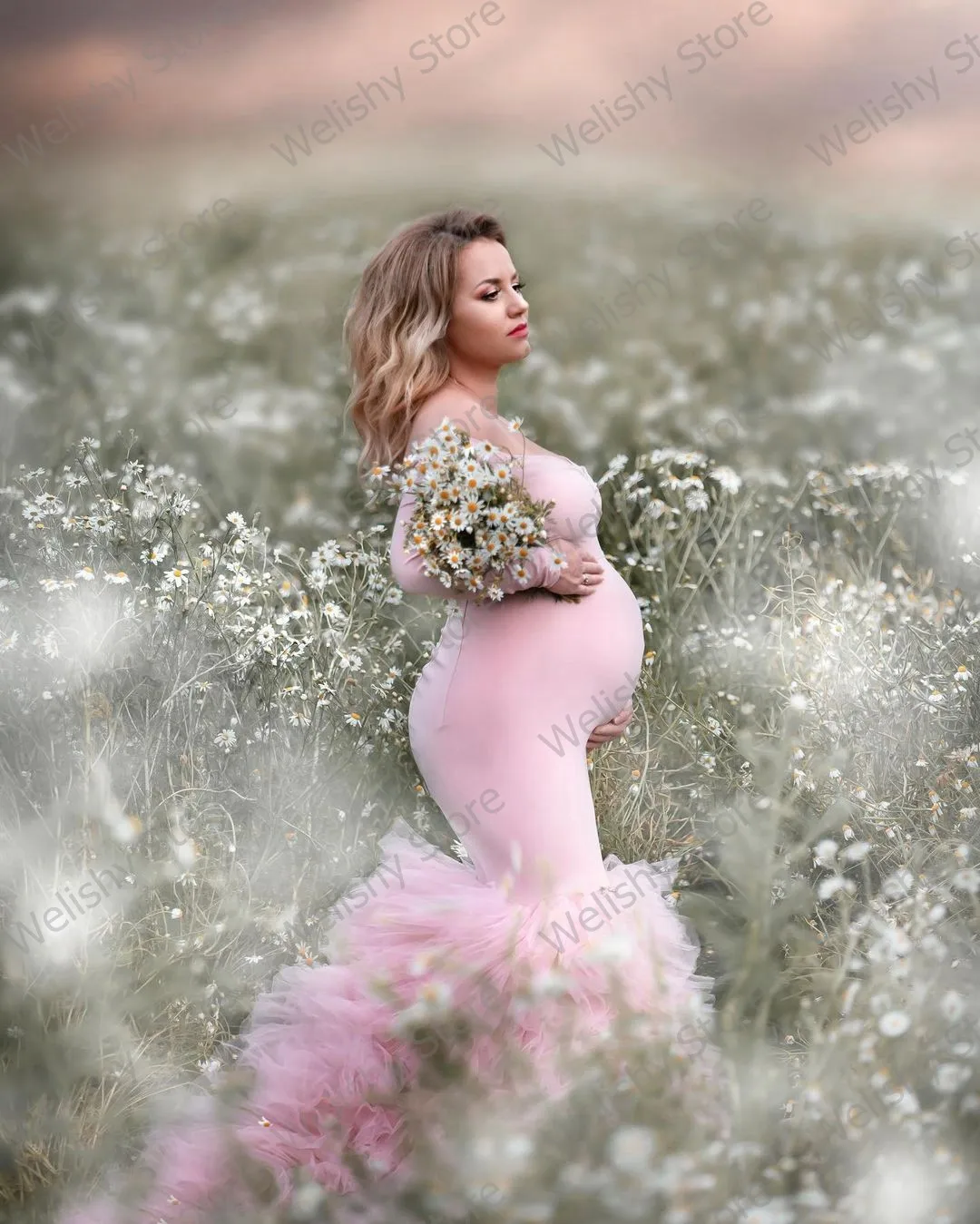 Розовое платье для беременных из эластичного спандекса с открытыми плечами и длинными рукавами Плиссированное Тюлевое платье с юбкой-годе и шлейфом