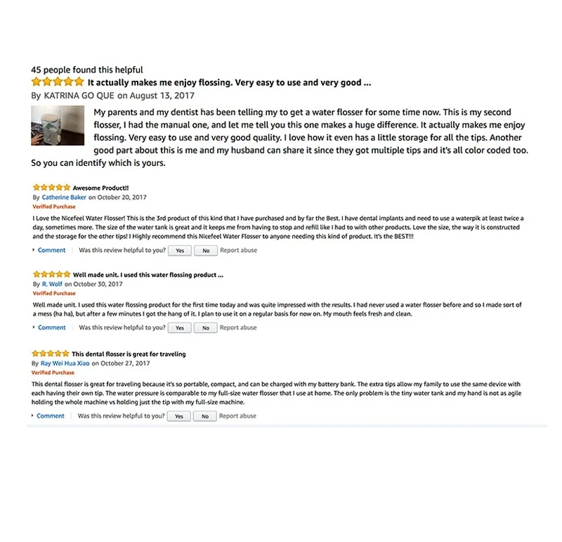 Особенность:2018 новейший Флоссер для воды-большая емкость 1000 мл, избегайте частого наполнения водой.Сохраняйте гигиену полости рта-стоматологическая струя воды обеспечивает импульс высокого давления 1700 в минуту и 30-100 фунтов на кв. дюйм, что позволяет смывать пятна на зубах, щелевать грязь, зубной налет и бактерии легко, что традиционная чистка не может достичь.Двойная Водонепроницаемая конструкция-Флоссер для воды специально разработан с внутренней и внешней двойной водонепроницаемой защитой, более безопасен для использования для душа в ванной комнате. Автоспуск на две минуты, чтобы избежать работы после очистки.Регулируемый режим нитью-от 0 до 10 уровней светодиодный ными индикаторами. Выберите наиболее комфортный режим, соответствующий вашим потребностям. Уровень 2 рекомендуется для первого использования.В комплекте 7 сменных наконечников-на ручке есть кнопка выпуска наконечника, нужно лишь аккуратно нажать на кнопку, наконечник будет выпущен, быстро и удобно. Комплексная очистка, подходит для семейного использования.Универсальное напряжение-Совместимость с блоком питания 100-240 В для путешествий в любую точку мира. Использование:Просто наполните резервуар водой, направьте наконечник на линию десен и нитью.Наполните теплой водой для чувствительных зубов или добавьте ополаскиватель для полости рта.Содержимое упаковки:1 x Основная машина1 резервуар для воды1 x Крышка Резервуара с хранилищем Для Наконечников7 наконечников (3 классических наконечника струи, 1 наконечник искателя налета, 1 ортодонтический наконечник, 1 Карманный наконечник Pik, 1 Очиститель языка)1 x ручка1 x Руководство пользователя на английском языке Этот Флоссер теперь горячая Распродажа и получил множество восторженных отзывов на Amazon: