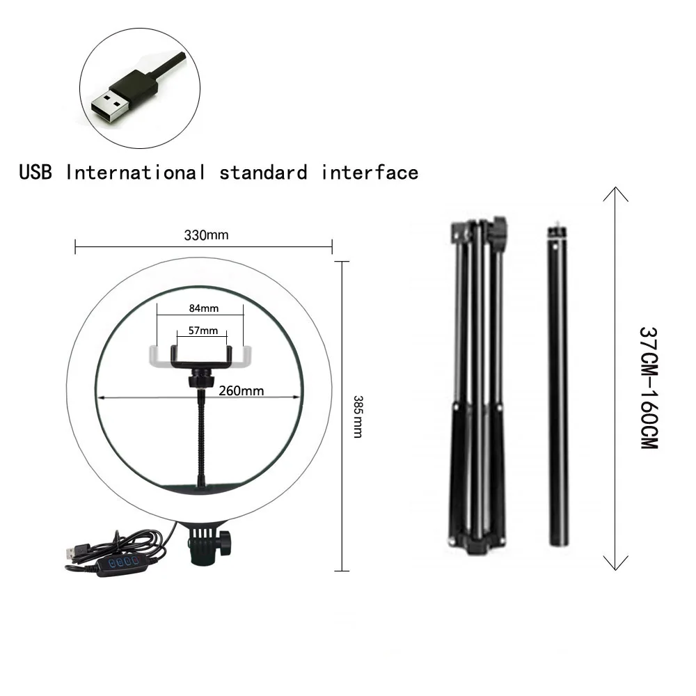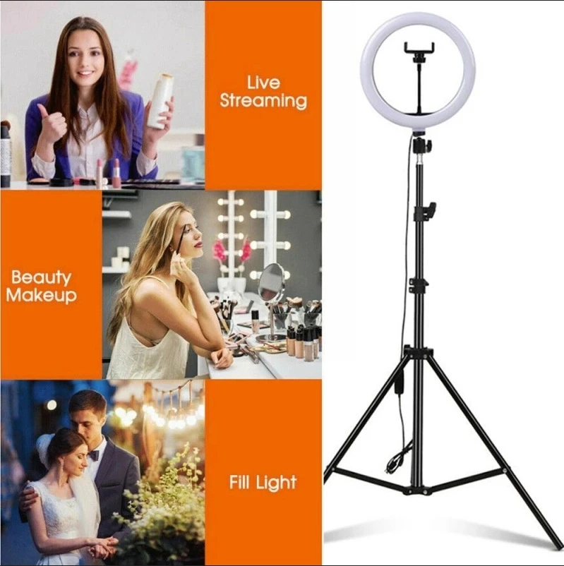 Характеристики: 1).10 режимов яркости. 2).3 цвета, плавное затемнение, светильник, теплый светильник, мягкий светильник. 3). Регулируемая светильник вая подставка 1,6 м для универсальной высоты и очень устойчивости. 4). Со студией для заполнения светильник вого фото, портретной автоспуска заполнения светильник. 5). Кольцевой светодиодный светсветильник льник для фотостудии с USB-разъемом. 6). Подходит для многих общественных мероприятий, таких как макияж, видео в прямом эфире, студисветильник, фотография. Описание: Название товара: кольцевой светильник для селфи в реальном времени Зарядка: USB-штекер Тип: кольцевой светильник с подставкой/кольцевая лампа для макияжа Регулируемый штатив Светильник: 26 см/10 дюймов в диаметре Цвет светильник: светильник, теплый светильник, мягкий светильник Материал: алюминий + ПК Диапазон затемнения: 1%-100% Цветовая температура: 3200K-5500K Источник светильник: светодиодный SMD Мощность: 10 Вт Светодиодные лампы: 64 светодиодный Использование: продукция/рекламная фотография, красисветильник с прямым заполнением лампы, студия для макияжа видео в прямом эфире