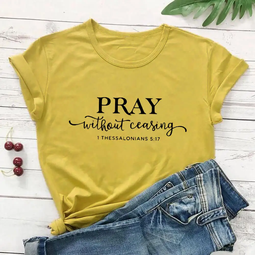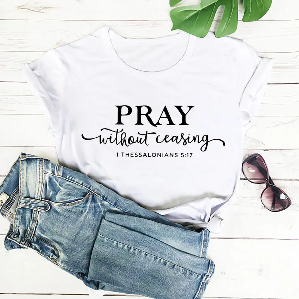 Женские летние христианские рубашки с надписью Молитва без переставания, Вера, топ с коротким рукавом, футболка с Иисусом, 100%, хлопчатобумажная женская футболка