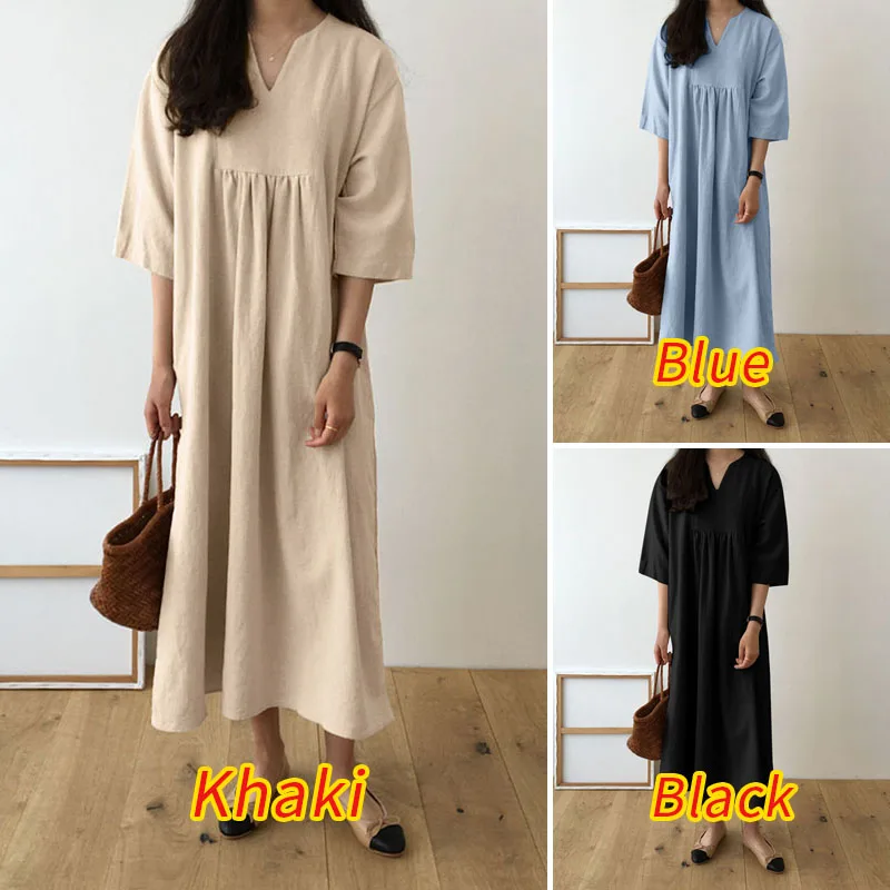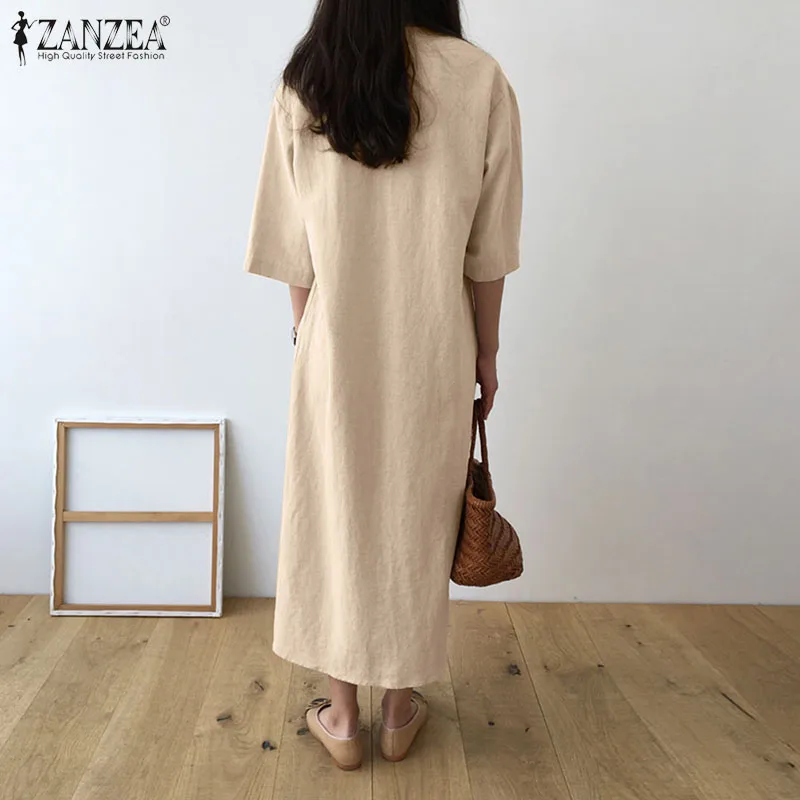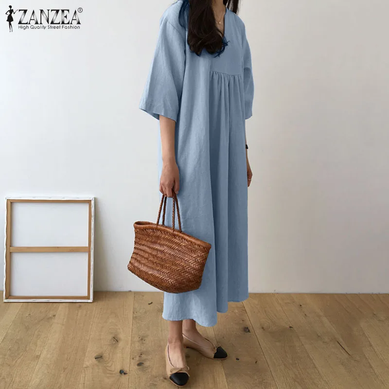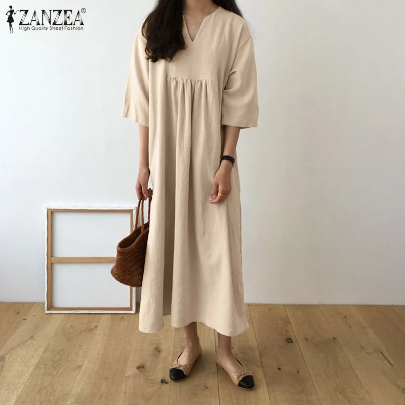 Женский сарафан с рукавом 34 ZANZEA 2021, модное весеннее однотонное платье макси, повседневные платья, женское платье с высокой талией и V-образным вырезом