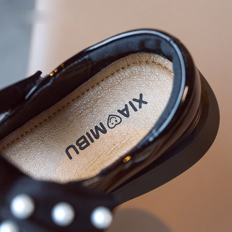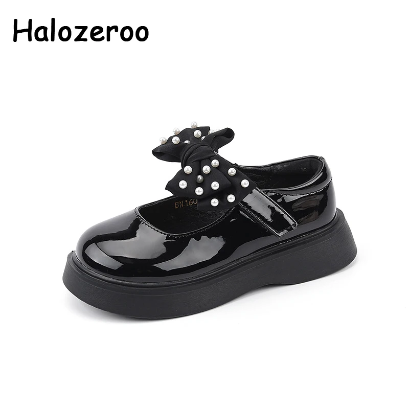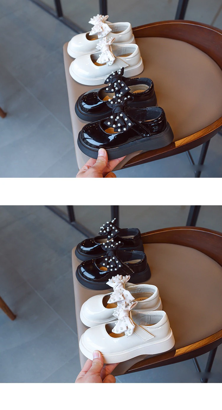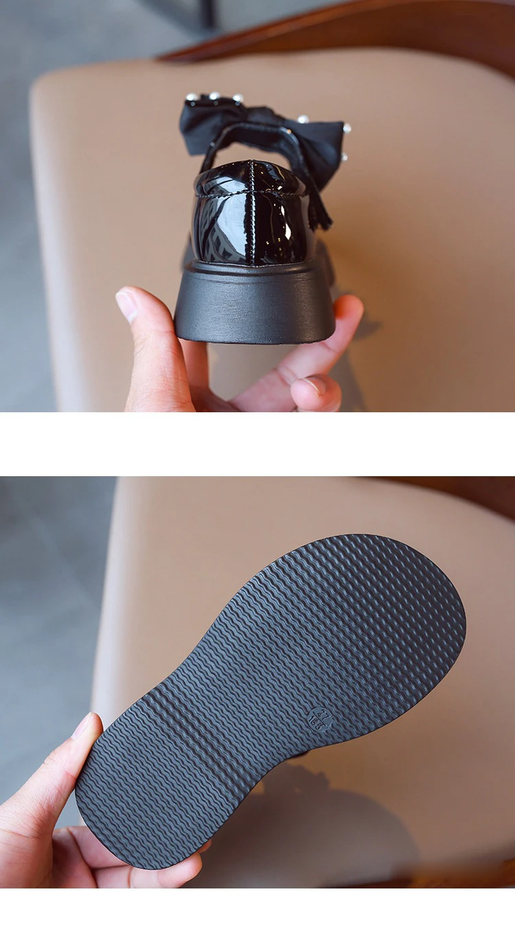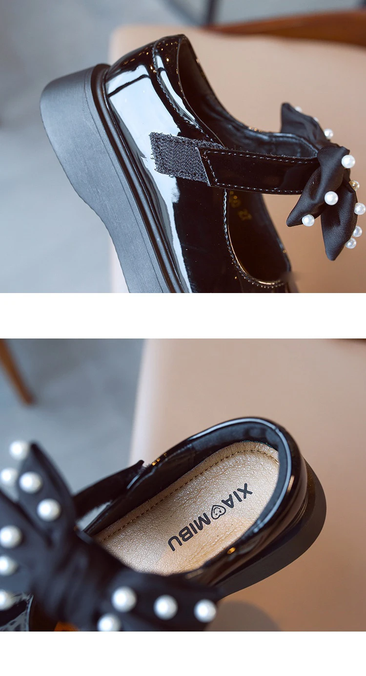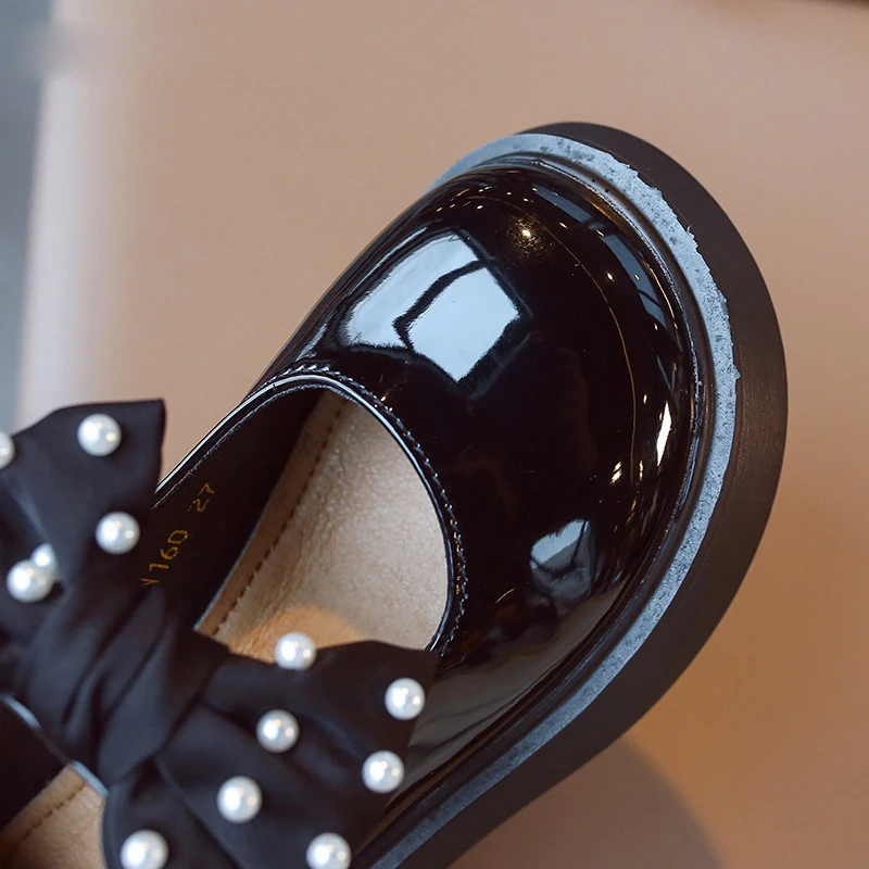 Туфли детские, черные, с бантом, на плоской подошве, с жемчугом, для девочек, весна 2021