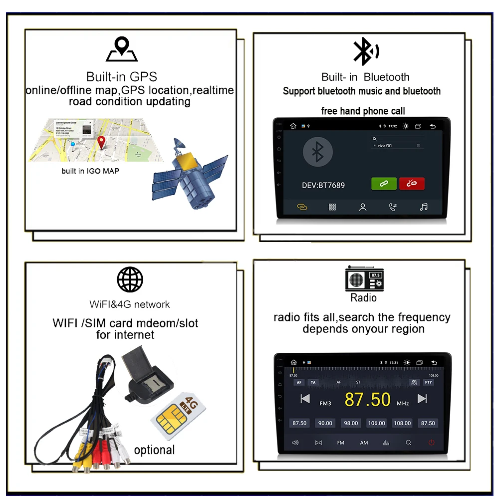 9-дюймовый емкостный экран 2.5D QLED (опционально) + Quad /Octa Core 1,2/2,5 GHZ CPU + 2GB (6GB опционально) Flash + 32GB Memory (64/128GB опционально) + Встроенный Wi-Fi (опционально сеть 4G) + GPS-навигация (карта Поддержка бесплатного обновления) + управление рулевым колесом + зеркальная ссылка + Bluetooth + Встроенный микрофон + FM/AM + RDS (опционально) + Поддержка функции USB ADAS DVR + Функция Europe DAB + 1080P Vedio Play + HD 1280*720 + контроль давления в шинах Система > Поддержка ЯзыковРусский, английский, испанский, итальянский, французский, чешский, арабский, немецкий, иврит, китайский, эстонский, польский, филиппинский, финский, корейский, голландский, хорватский, латышский, литовский, румынский, норвежский, португальский, японский, шведский, тайский, турецкий, украинский, венгерский, словацкий, датский, словенский более 50 видов языков. > Поддержка обслуживания 24H * 7В Nevegetor мы стремимся к лучшему обслуживанию наших уважаемых клиентов, ориентированному на сервис, добросовестной и приемлемой цене для философии нашего бизнеса. Мы с нетерпением ждем возможности сотрудничать с взаимовыгодной атмосферой.