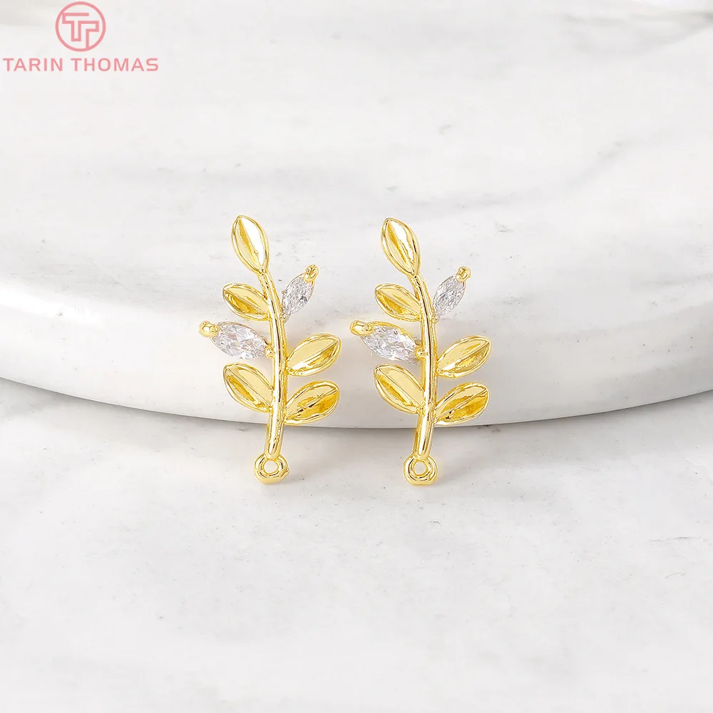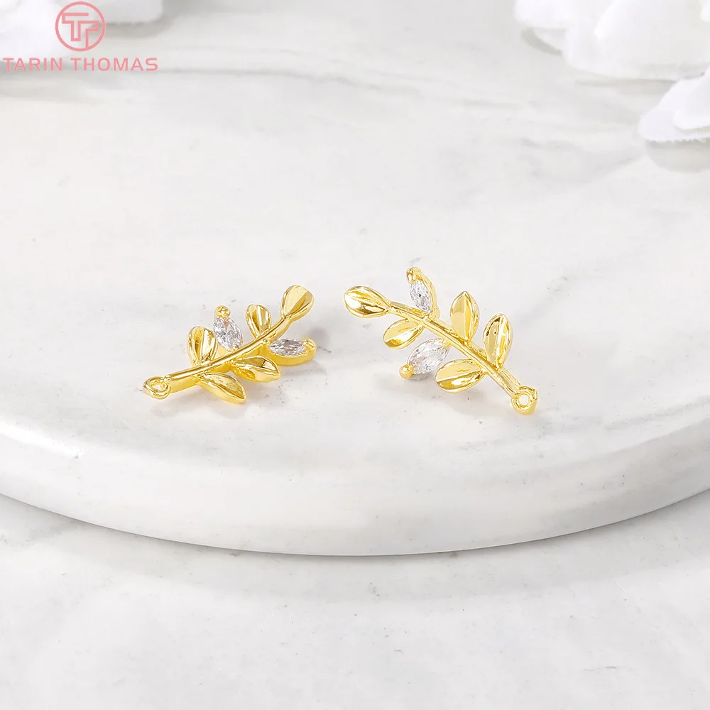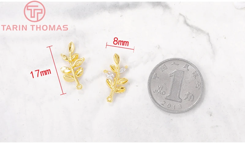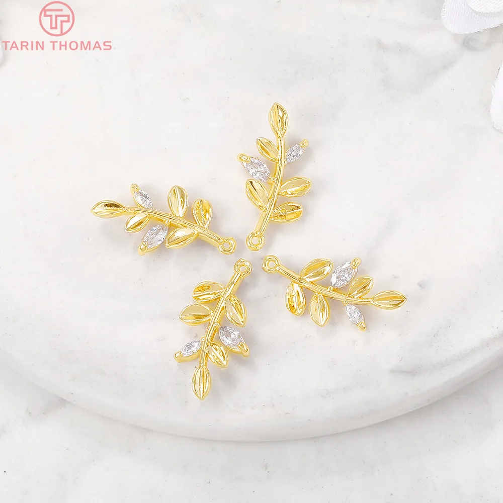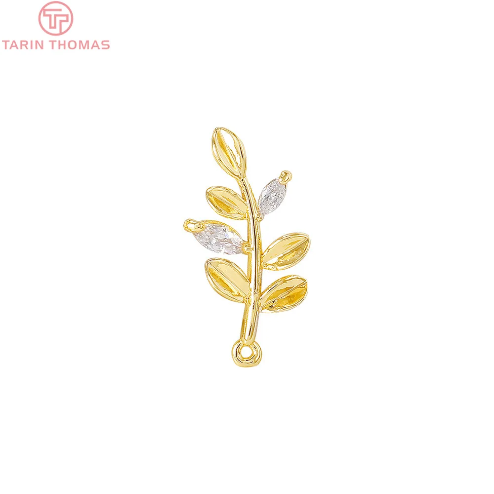 Латунные подвески с листьями из циркония, отверстие 1 мм, 24 к золотого цвета, 6 шт., фурнитура для изготовления ювелирных изделий, 8 х17 мм