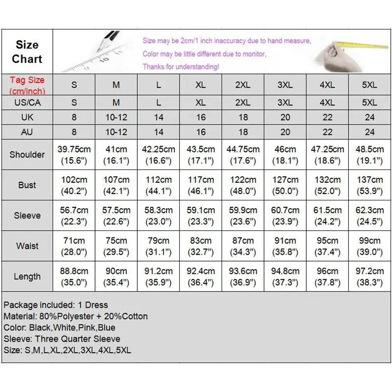 Пожалуйста, ознакомьтесь с размерами в таблице размеров перед покупкой!Посылка входит: 1 платьеМатериал: 80% полиэстер + 20% хлопокЦвет: черный, белый, розовый, синийРукав: рукав три четвертиРазмер: S,M,L,XL,2XL ,,,Узор: СплошнойДлина: длина до бедраОсобенности: плиссировкаСтиль: ОтдыхСезон: летоПовод вечерние, праздник, уличная одежда
