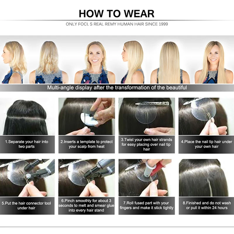 Товар: волосы Remy Nano Ring для наращивания на станкеНазвание бренда: JF машина для производства волос Remy серииВарианты цвета:Темный цвет: 1 #, 1b #, 2 #, 4 #, 6 #Светильник Цвет: 60 #Длина, вес и количество:12 дюймов = 30 см, 1 г/шт., 100 грамм/упаковка16 дюймов = 40 см, 1,0 г/шт., 100 грамм/упаковка20 дюймов = 50 см, 1,0 г/шт., 100 грамм/упаковка24 дюйма = 60 см, 1,0 г/шт., 100 grams/packПредложение по применению:Если у вас короткие волосы, вы хотите эффект длинных и объемных волос, купите 200 штук (4 упаковки).Если у вас длинные волосы, но тоньше, вы хотите эффект объема, купите 100 ~ 150 штук (2 ~ 3 упаковки).Если вы хотите эффект подсветки или хотите больше объема, купите дополнительные 50 штук (1 упаковка)Марка ленты и Размер ленты:Наконечник кератина: оригинальный итальянский Кератиновый клей используется только!Наконечник Размеры: 1,5 см в длинуПолитика Возврата:15 дней без причины возврата, свяжитесь с нами, если вы хотите вернуть деньги