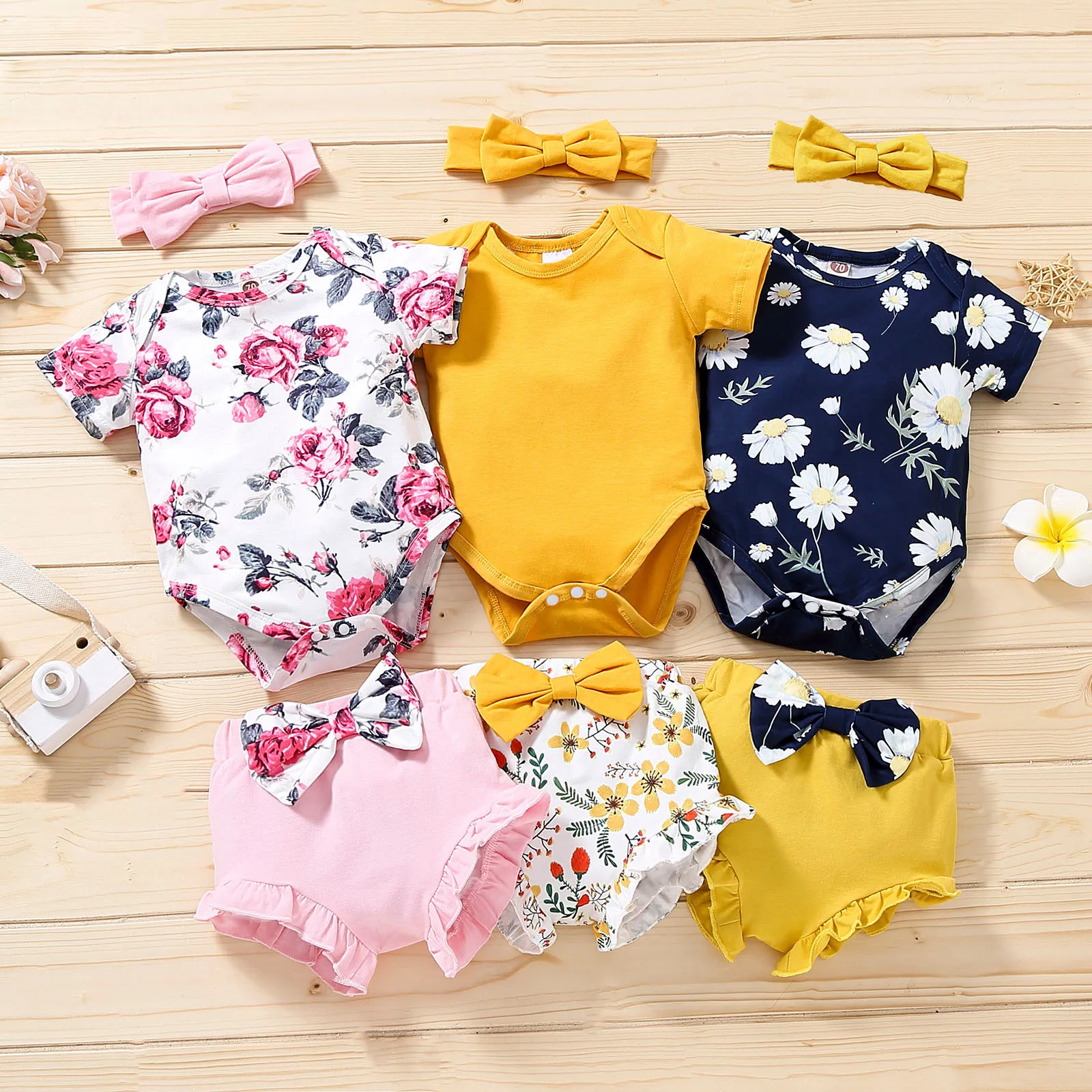 Для малышей и новорожденных Одежда для детей, одежда для маленьких девочек, с цветочным принтом, боди-комбинезон, шорты с бантиком комплект для девочек комплект из 3 предметов, Летний милый комплект одежды