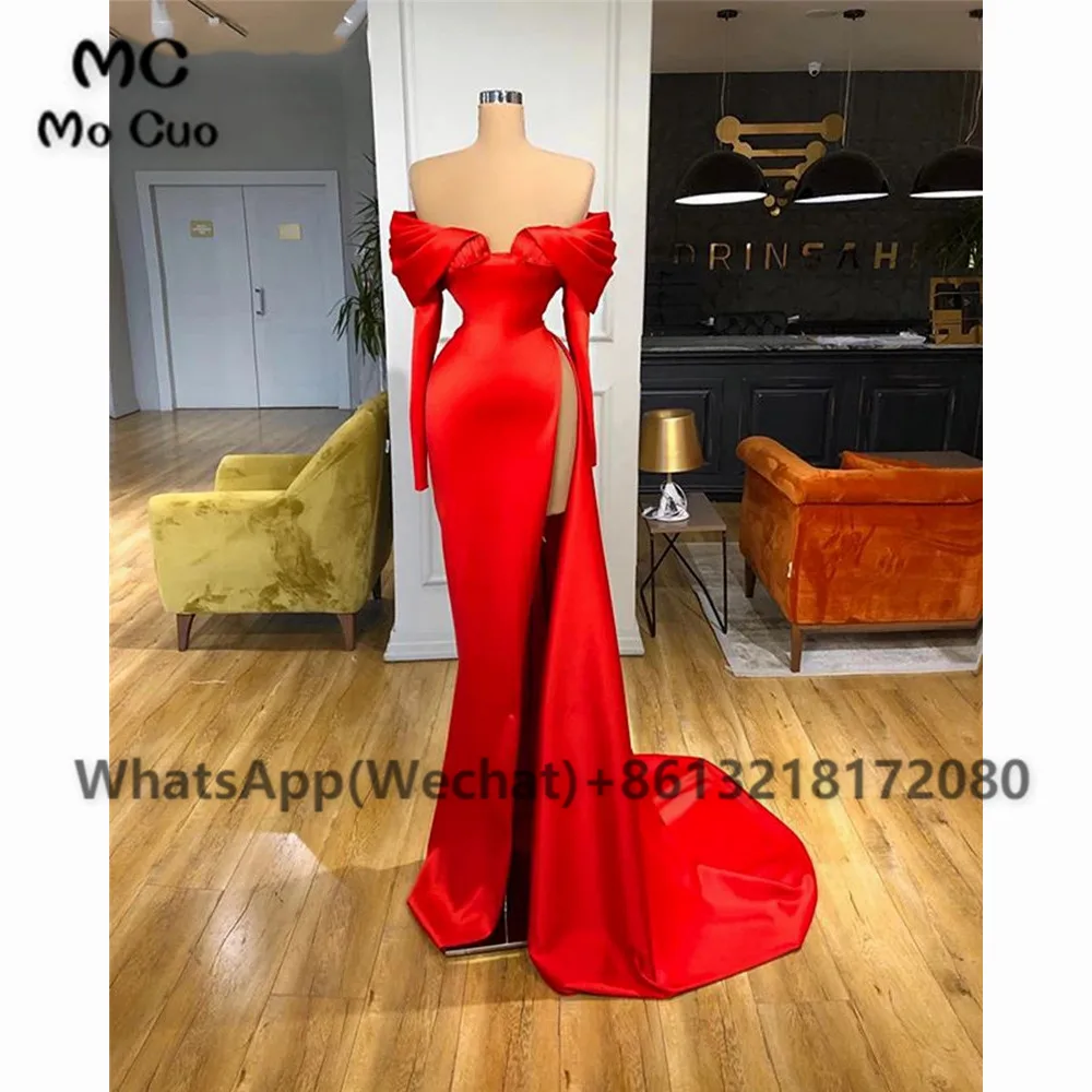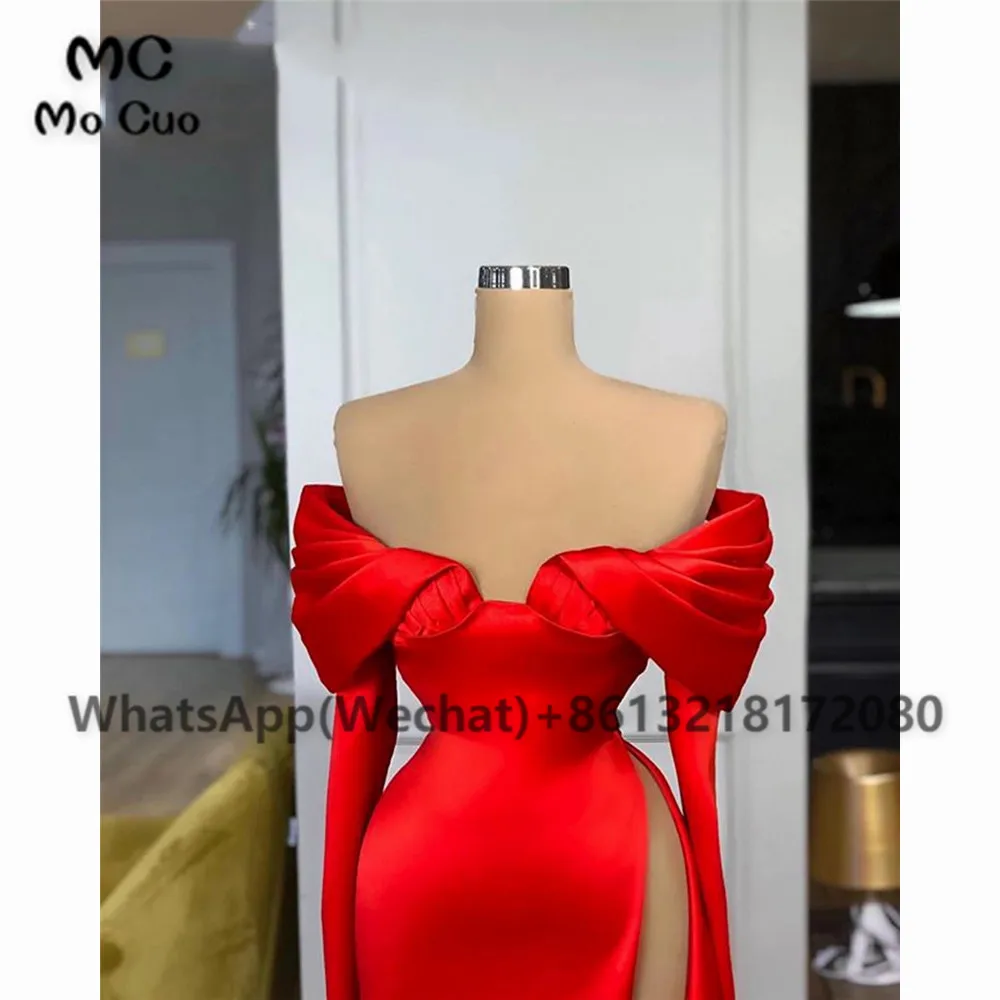 Женское вечернее платье с открытыми плечами, Красное Атласное плиссированное платье с высоким разрезом и длинными рукавами, платье для выпускного вечера, 2021