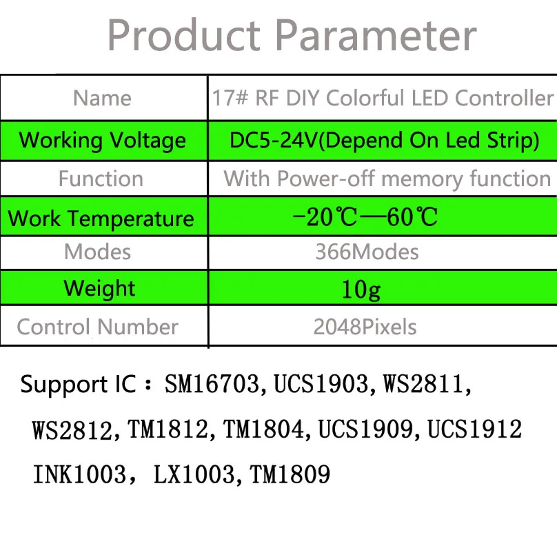 @ Обратите внимание1. Если заказ не более 5 долларов, номер отслеживания отсутствует!2. WS2812B Светодиодные полосы можно вырезать купить каждый "один" светодиодный чип!3. IP30: не водонепроницаемыйIP65: водонепроницаемое силиконовое покрытиеIP67: водонепроницаемый в силиконовой трубке4. WS2812B Светодиодная лента работает с DC5V, и она должна быть нужна aWS2812B Led контроль ler его5. Эта цена включает светодиодную ленту и контроллер, не включает источник питания.Дешифрование продукта:1>. Светодиодная лента WS2812B питается от «5 В питания» (не входит в комплект) и управляется ASingle линией передачи данных от подходящего контроллера (не входит в комплект).2>. 3-контактный разъем JST разъем в комплекте: красный, защита от перегрузки: VCC лозы: GND, Зеленый: данные.3>. Полоска имеет клейкая лента 3M на задней части (за исключением Ip67). Поверхность установки должна быть гладкой, чистой и сухой.4>. Светодиодная лента может быть разделена между каждым светодиодом для создания пользовательских длин.5>. Не сгибайте полоску.6>. Более длительные пробежки должны питаться от обоих концов, чтобы уменьшить падение напряжения.7>. 3-контактный разъем JST разъем провод 20AWG.Информация о продукте:Входное напряжение: DC5VМощность: 30 светодиодов/м ---- 9 Вт/метр60 светодиодов/м ---- 18 ватт/метр74 светодиода/м ---- 22,2 Ватт/метр96 светодиодов/м ---- 28,8 Вт/метр144 светодиодов/м ---- 43,2 Вт/метрСветодиодный ресурс: WS2812B светодиодный (5050 SMD RGB светодиодный со встроенной улучшенной версией WS2811 IC)Светодиодный: Каждый светодиодный отдельно управляемый светодиодныйТип IC: улучшенная версия WS2812 IC (Встроенный светодиодный индикатор 5050SMD RGB)ИС: 1 IC дисков 1 Led чипПиксели: 30/60/74/96/144/метровШаг: 16,6 мм (1000/64)Серые Весы: 256Биты/Цвет: 8 бит/цветFPC ширина: 30 светодиодов/м ---- 10 мм60 светодиодов/м ---- 10 мм74 светодиода/м ---- 10 мм96 светодиодов/м ---- 10 мм144 светодиодов/м ---- 12 ммЦвет FPC: черный/белыйСтепень защиты: IP30/ IP65 /IP67Цвет s: полный цвет RGB, изменение цвета мечтыМожно резать: Каждый светодиодныйПосылка: в антистатическую сумку, IP30 IP65 с 3 м липкой лентой на задней части (IP67 без 3M клей)17 клавиш постоянного тока 2021-RF-DIY контроллер* Особенности:1. Радиочастотный пульт дистанционного управления, большое расстояние, мини-размер, проводное соединение простое и очень простое в использовании;2. Поддерживает почти каждый вид одного провода или двух проводов LED-DRIVER-IC ;(можно настроить)3. С 358 видами узоров, которые яркие и красивые;4. Каждый контроллер может управлять до 2048 пикселей;5. С пользовательской настройкой функции экономии;6. Регулировка яркости;7. Предотвращение обратного подключения источника питания.8. Рабочее напряжение: DC5-24V (батарея в комплект не входит)Применение продукции:WS2812B цветные полоски мечты используется для TV Hotel, K TV, Bar, игровой комнаты и другого отдыха, украшение для развлечений, чтобы повысить атмосферу, шасси автомобиля, украшение автомобиля, украшение магазина, украшение дома и другие украшения.