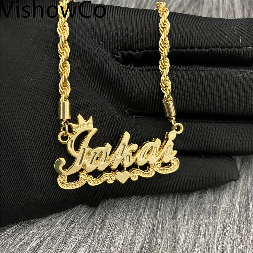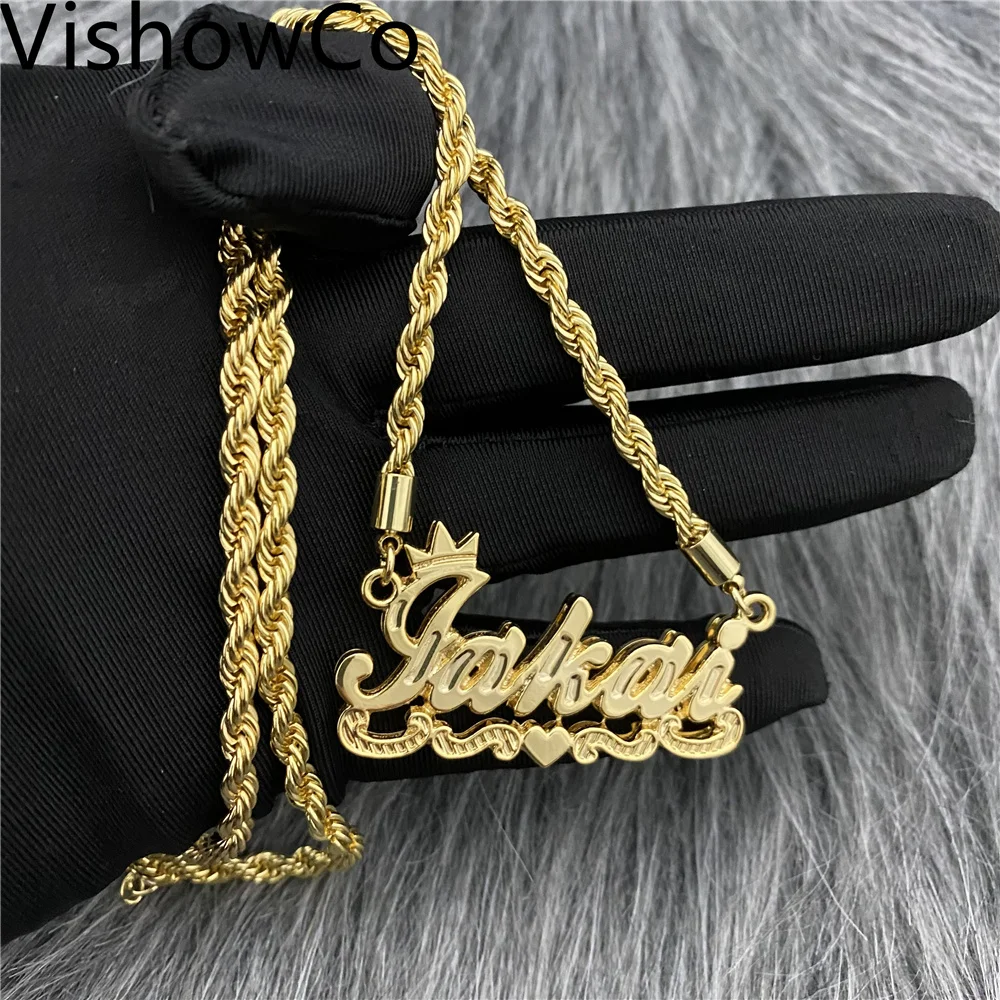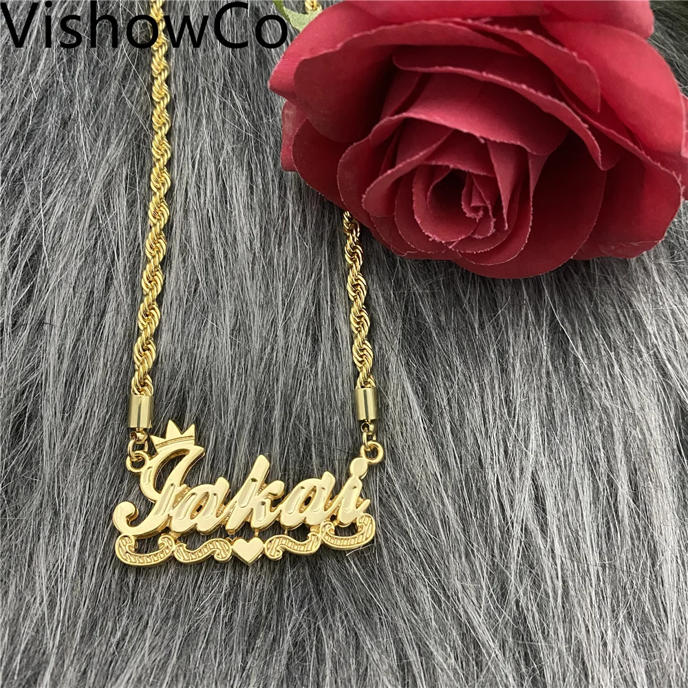 VishowCo циркониевое ожерелье с именем под заказ двойная позолоченная табличка 3D ожерелье ожерелья с именем под заказ золотистый чокер женский подарок